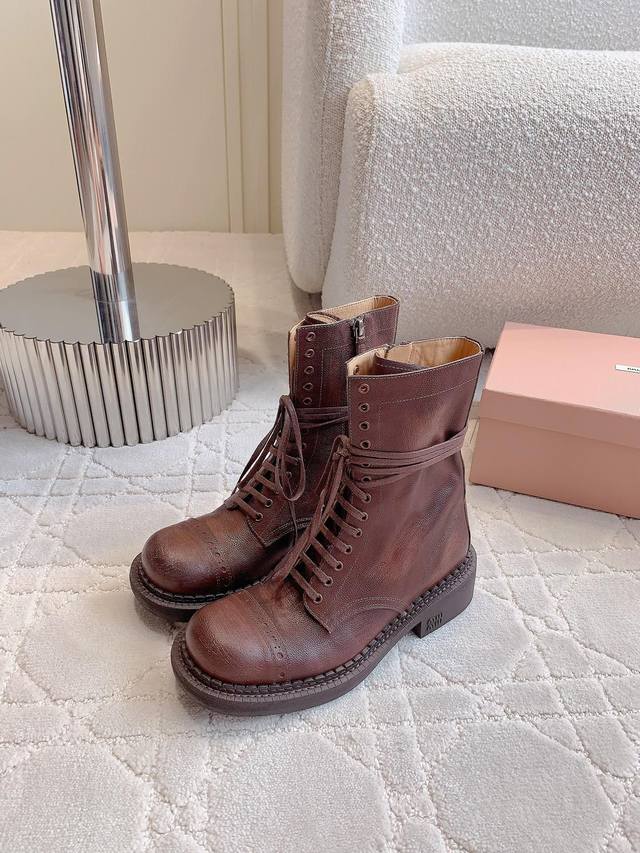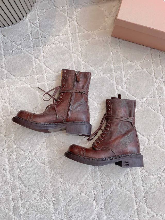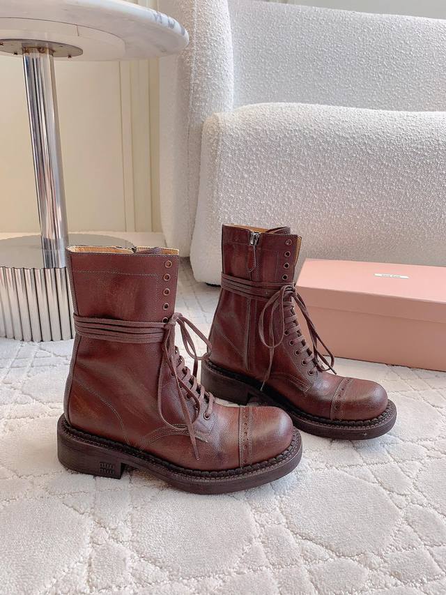 出厂价p Miu新款绑带骑士短靴 超好穿的版型 非常修饰腿型 上脚实在泰酷辣 鞋面小牛皮 内里垫脚牛皮 原版开模大底 尺码35-39 40定做