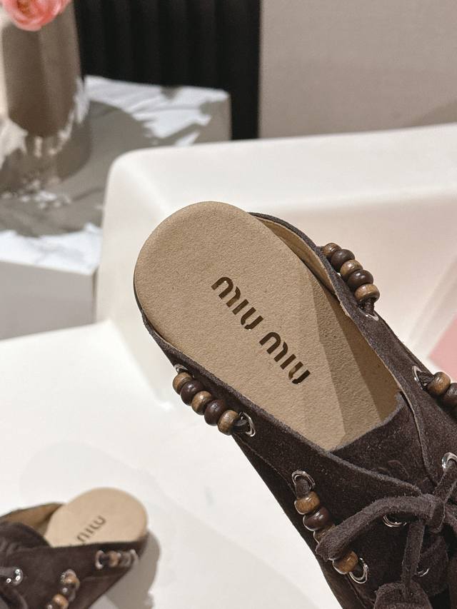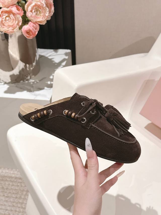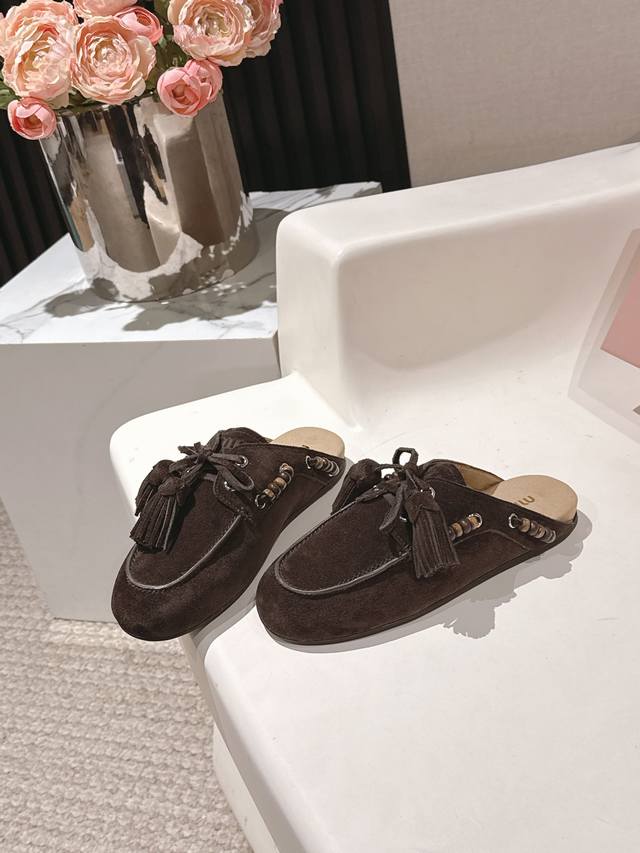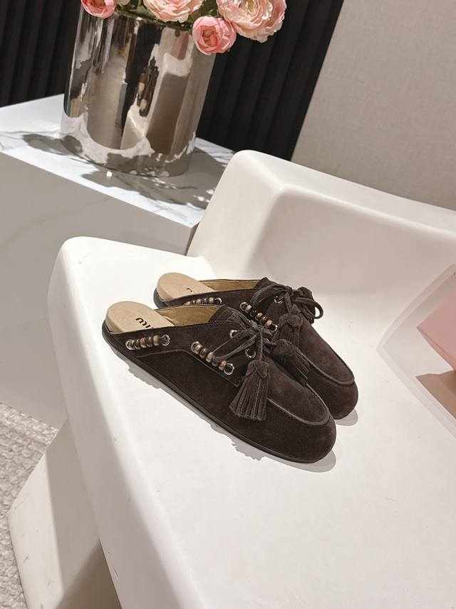 出厂价p Miumiu家新款Deck Shoes也太有设计感了吧,秋冬氛围感拉满,舒适又时尚,秋冬新款麂皮一脚蹬,俏皮的系带流苏,复古的干异色系,内里磨毛的设计