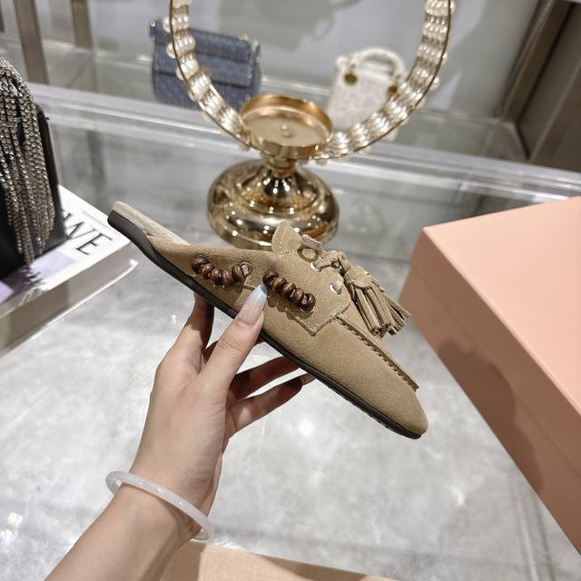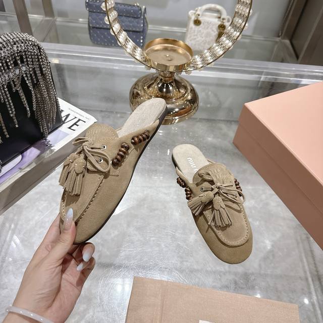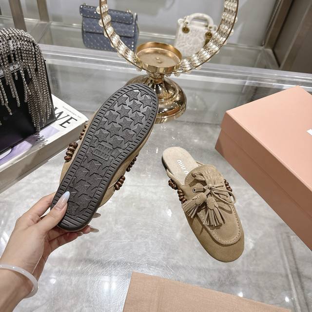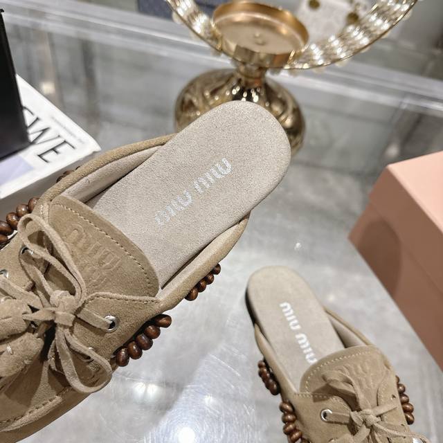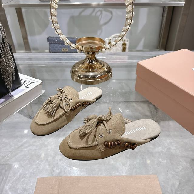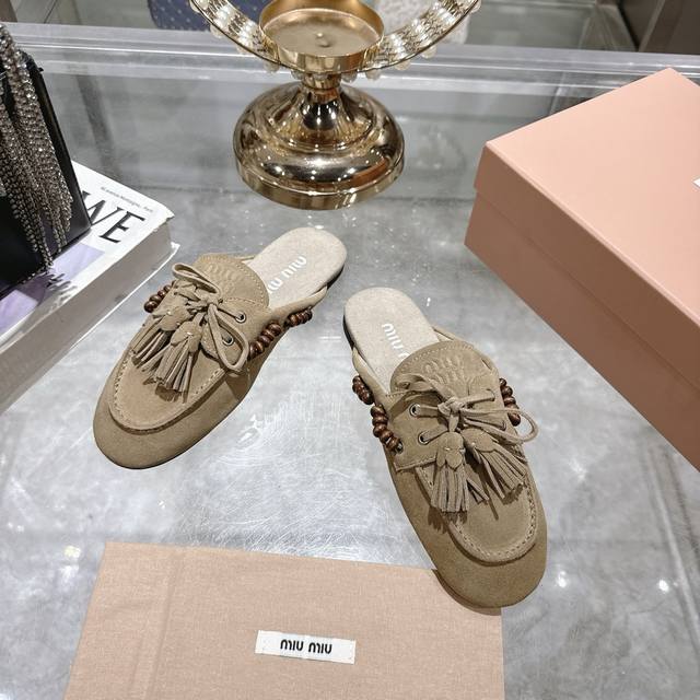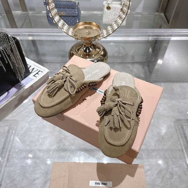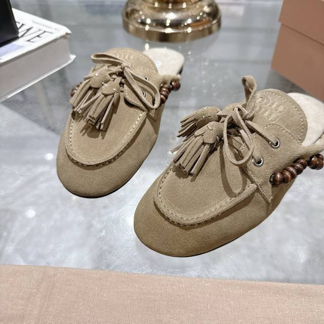 出厂拖鞋 单鞋50Miu Miu 系带鸡眼平底豆豆鞋 缪缪Miumiu25秋冬新款 一脚蹬 复古鞋 俏皮的系带流苏复古的干异色系 内里磨毛的设计 让穿着的体验更
