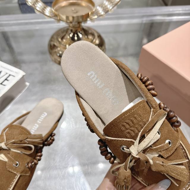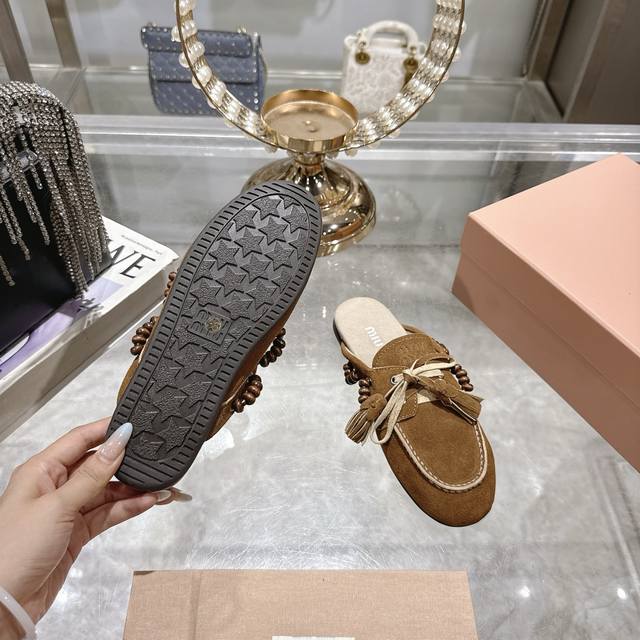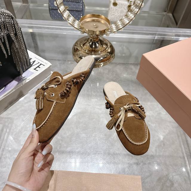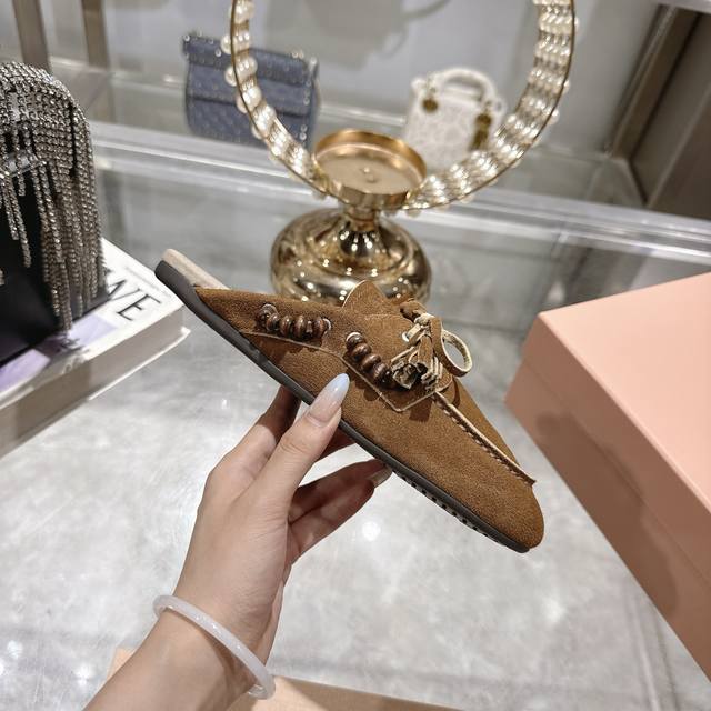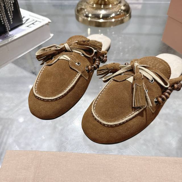 出厂拖鞋 单鞋50Miu Miu 系带鸡眼平底豆豆鞋 缪缪Miumiu25秋冬新款 一脚蹬 复古鞋 俏皮的系带流苏复古的干异色系 内里磨毛的设计 让穿着的体验更