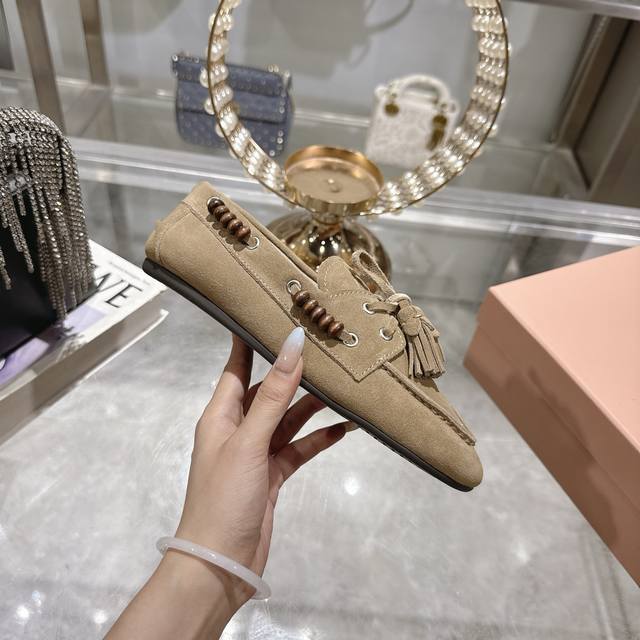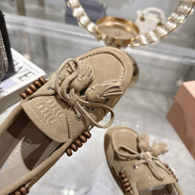 / 出厂拖鞋 单鞋50Miu Miu 系带鸡眼平底豆豆鞋 缪缪Miumiu25秋冬新款 一脚蹬 复古鞋 俏皮的系带流苏复古的干异色系 内里磨毛的设计 让穿着的体验更