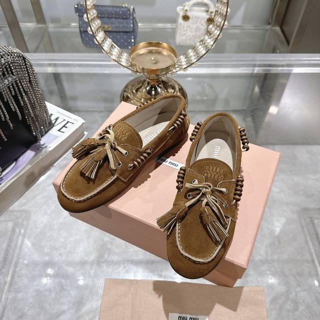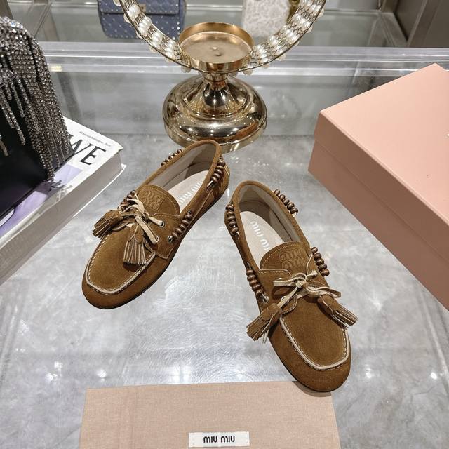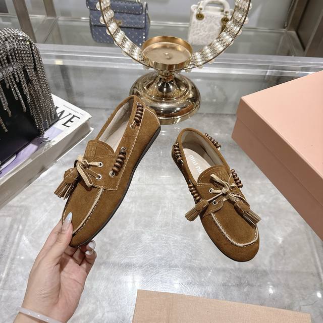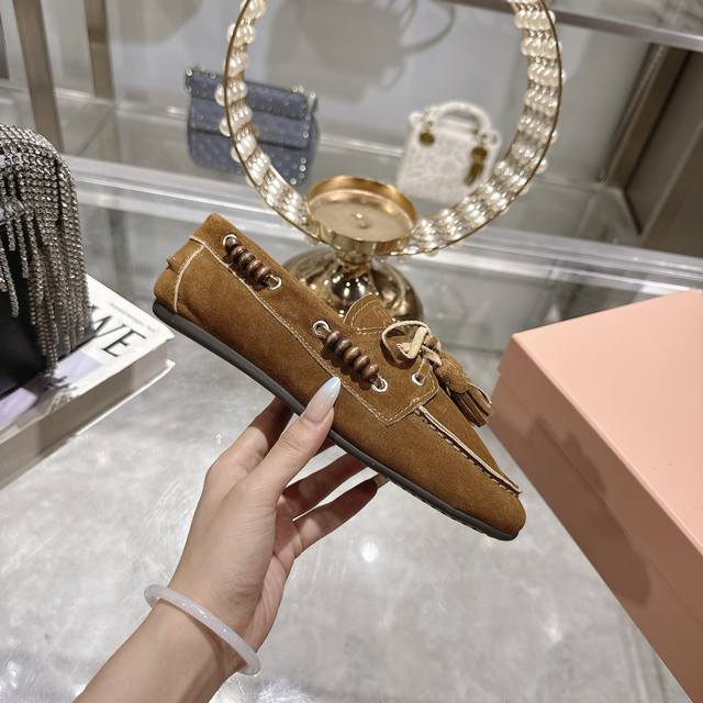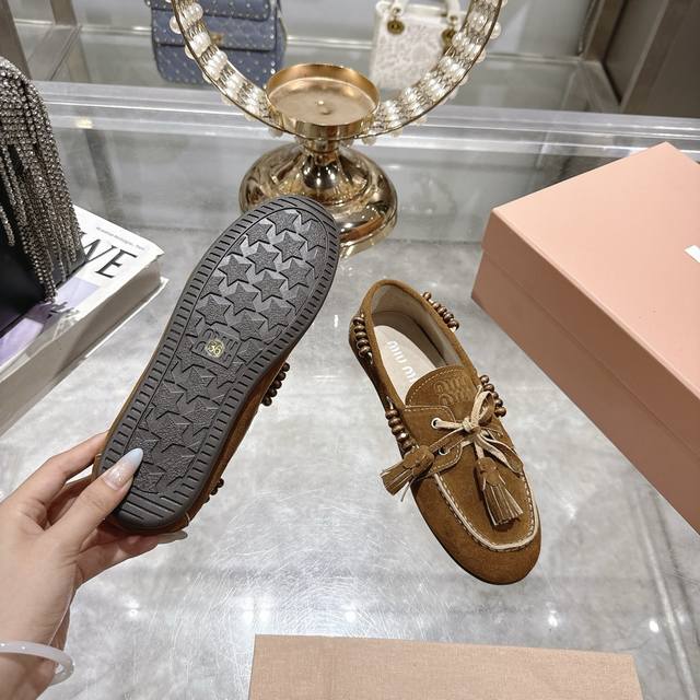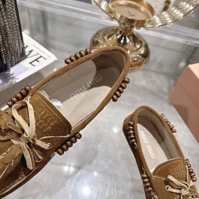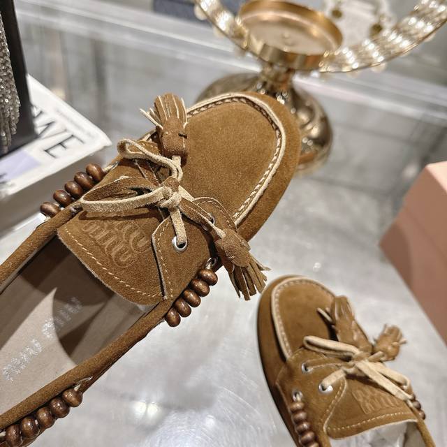出厂拖鞋 单鞋50Miu Miu 系带鸡眼平底豆豆鞋 缪缪Miumiu25秋冬新款 一脚蹬 复古鞋 俏皮的系带流苏复古的干异色系 内里磨毛的设计 让穿着的体验更