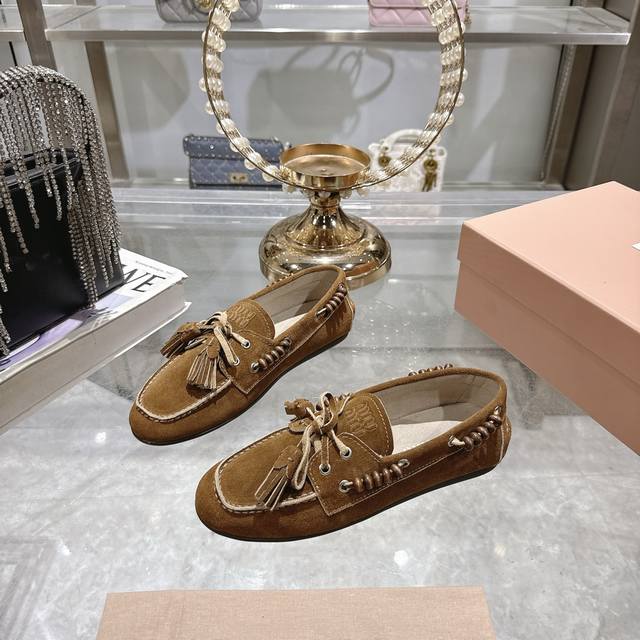 / 出厂拖鞋 单鞋50Miu Miu 系带鸡眼平底豆豆鞋 缪缪Miumiu25秋冬新款 一脚蹬 复古鞋 俏皮的系带流苏复古的干异色系 内里磨毛的设计 让穿着的体验更