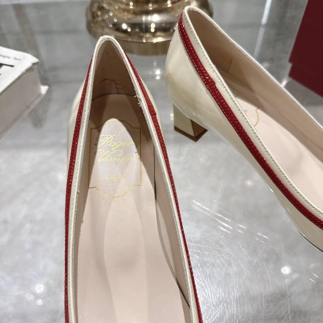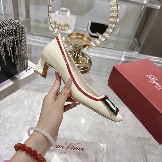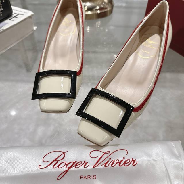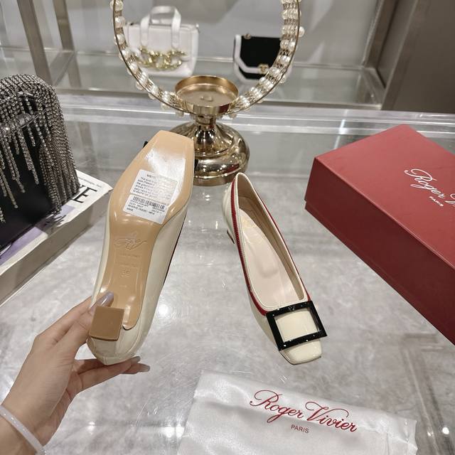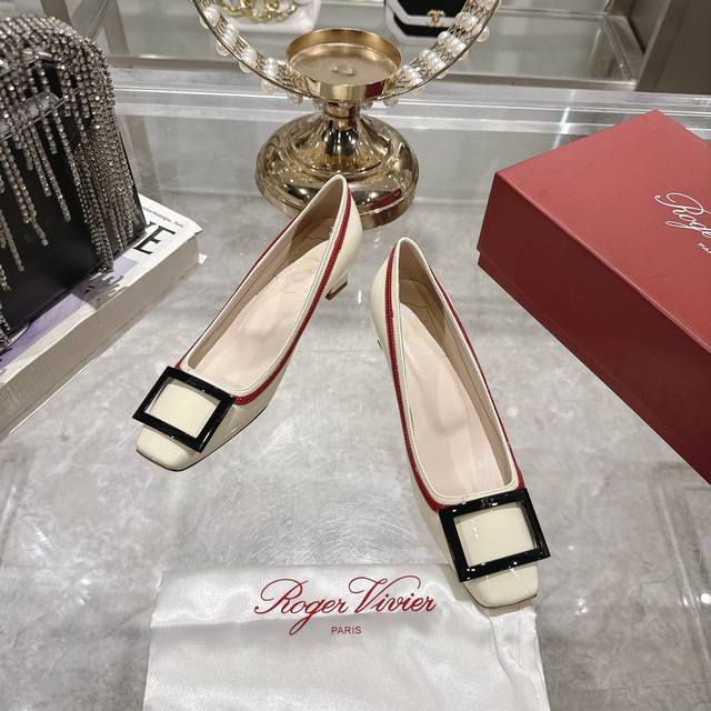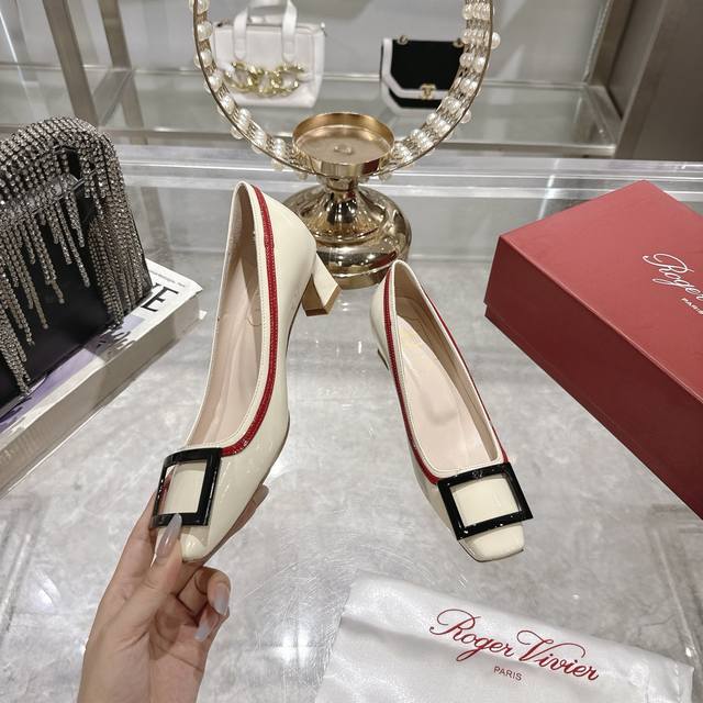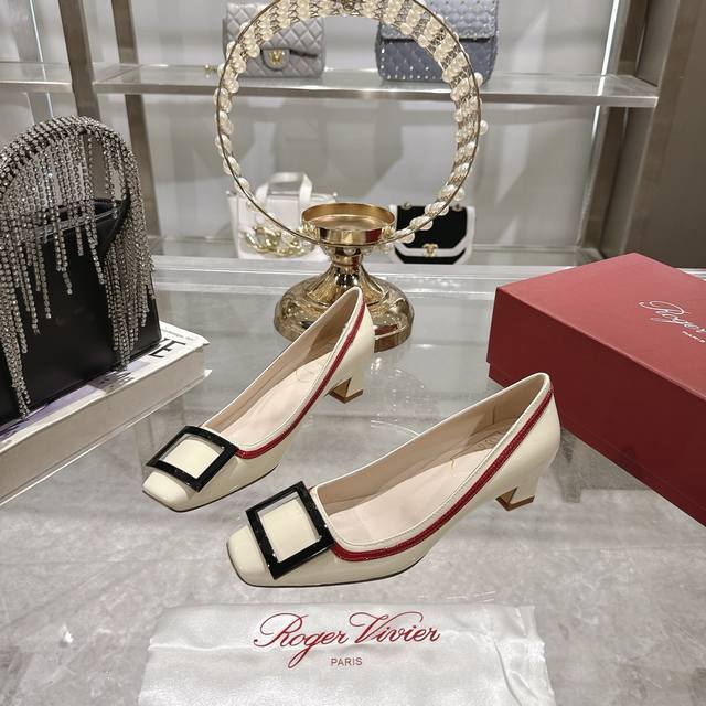 Rv女鞋鞋Trompett中跟粗跟方扣方头拼色单鞋女鞋. 本款单鞋百搭舒适.搭配金属方扣. 经典而不失创新. 倾斜的鞋跟为Trmpette增添无穷魅力.