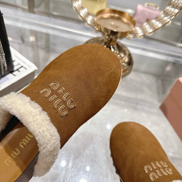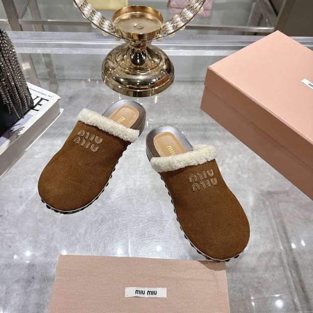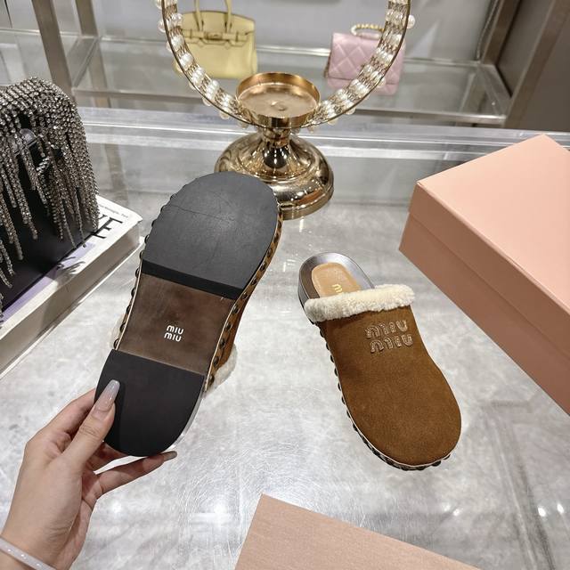 出厂 Miu Miu新款秋冬走秀实木底羊毛半拖,上脚舒适柔软,款式设计成半包 上脚特别方便哦,随走随穿