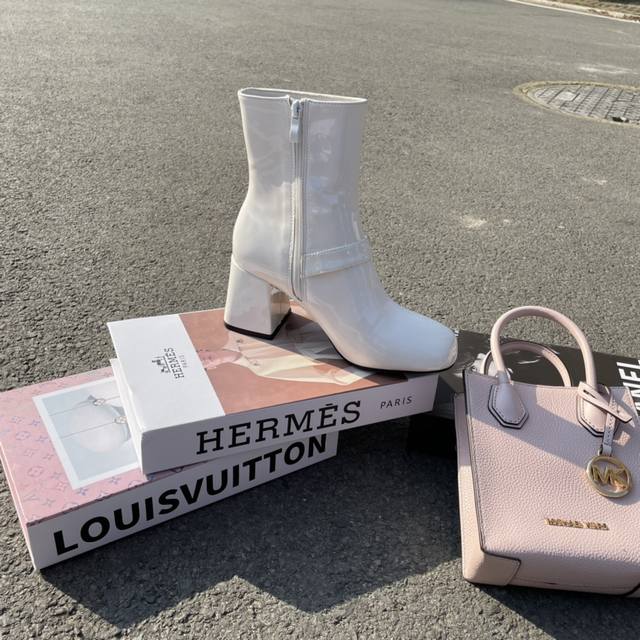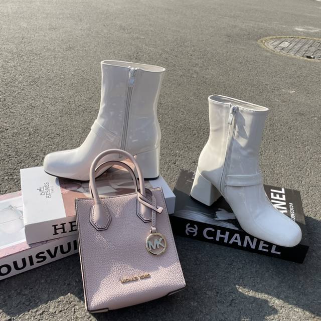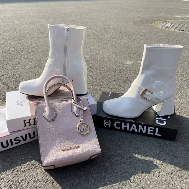出厂: Miumiu 2024 早春专柜 最高限定 顶级新款 两色首发 Mm皮扣粗跟短靴 原版开模 代购版本 进口软牛漆皮 原版miumiu饰扣 单里 绒里 跟