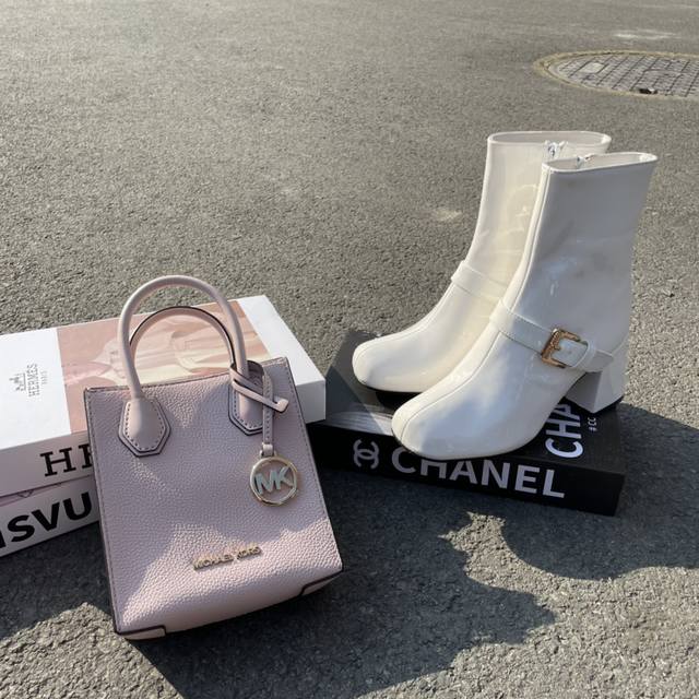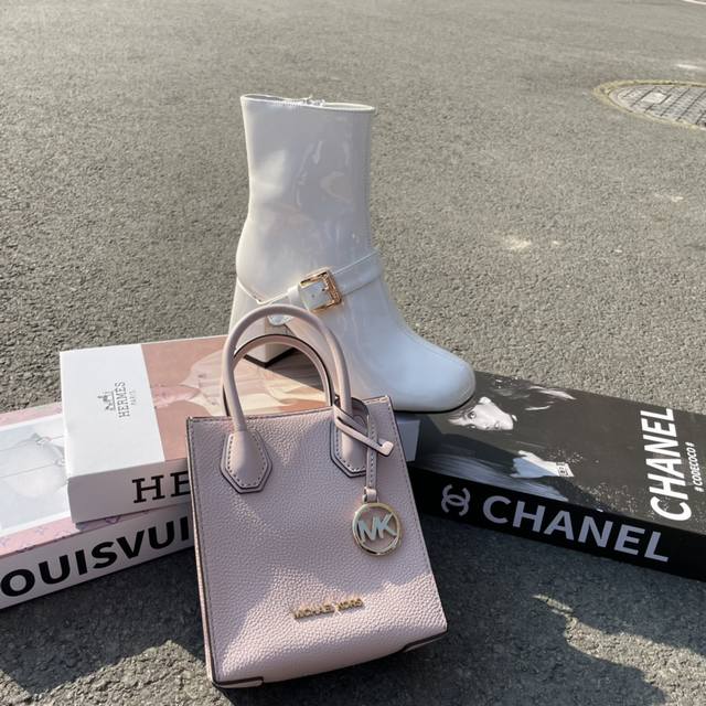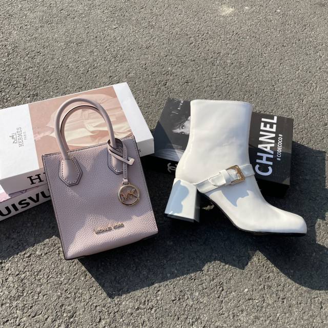 顶级新款 两色首发 Mm皮扣粗跟短靴