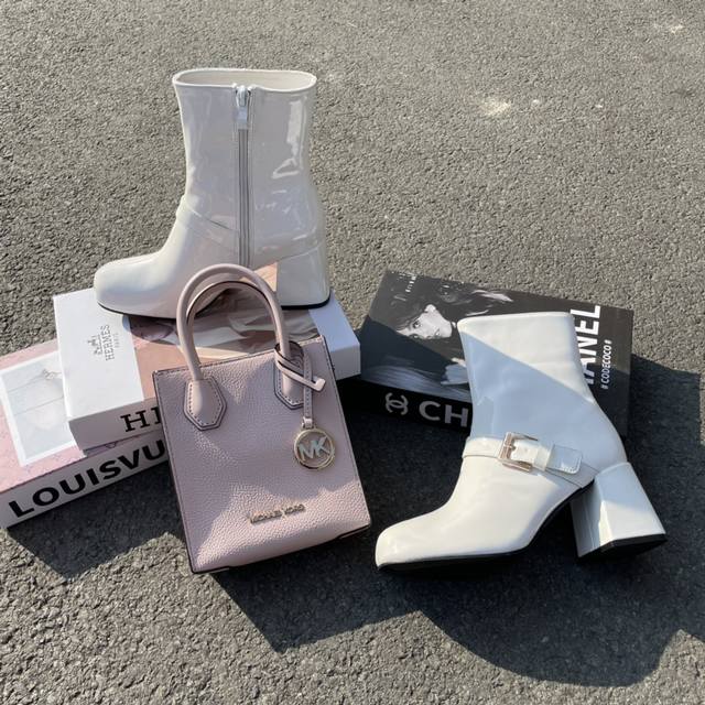 / 出厂: Miumiu 2024 早春专柜 最高限定 顶级新款 两色首发 Mm皮扣粗跟短靴 原版开模 代购版本 进口软牛漆皮 原版miumiu饰扣 单里 绒里 跟