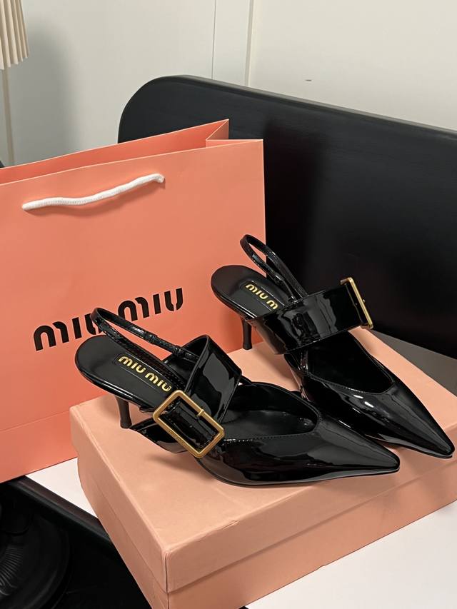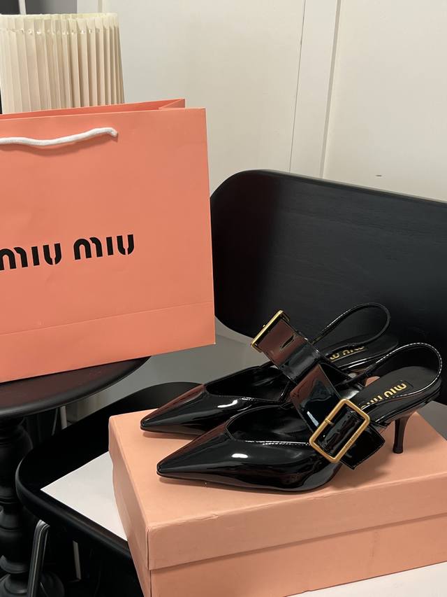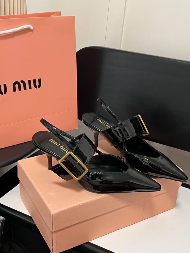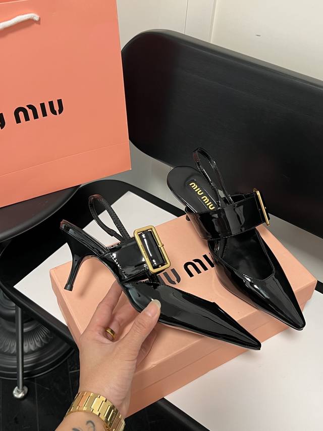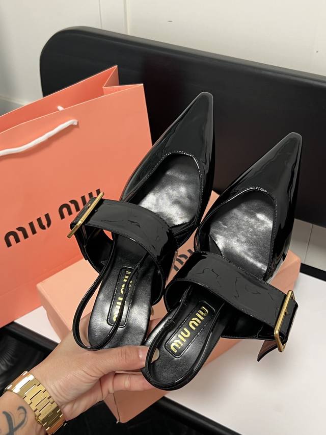出厂:Miumiu缪缪25Ss猫跟后空凉鞋logo金属扣面料进口牛漆皮内里垫脚羊皮真皮大底跟高:5.5Cm码数35-40