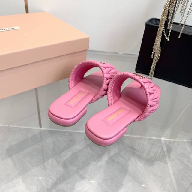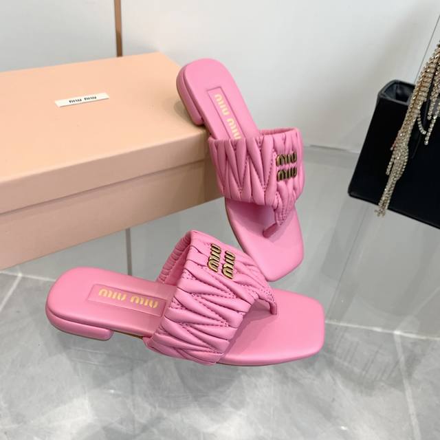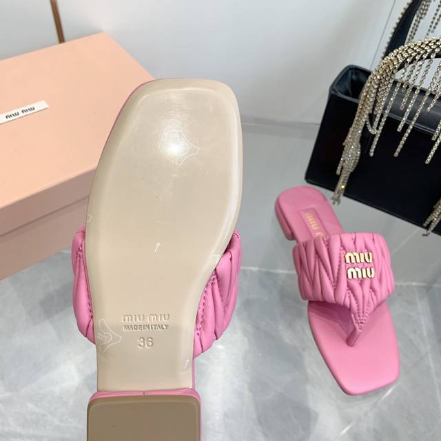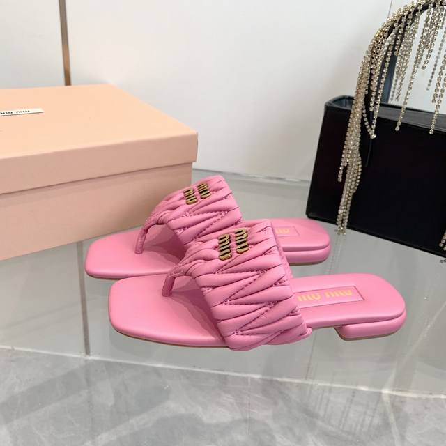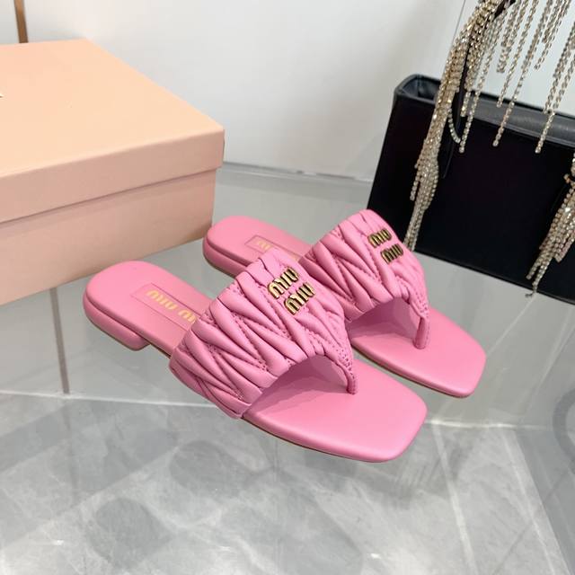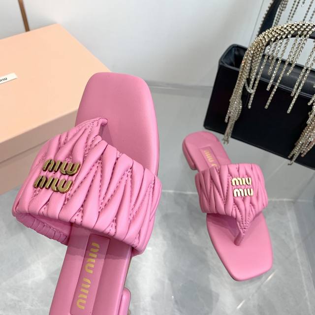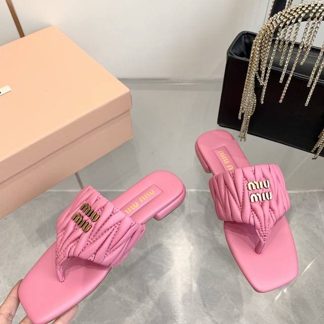 Miumi*Ss春夏新款平底小羊皮夹趾人字拖鞋