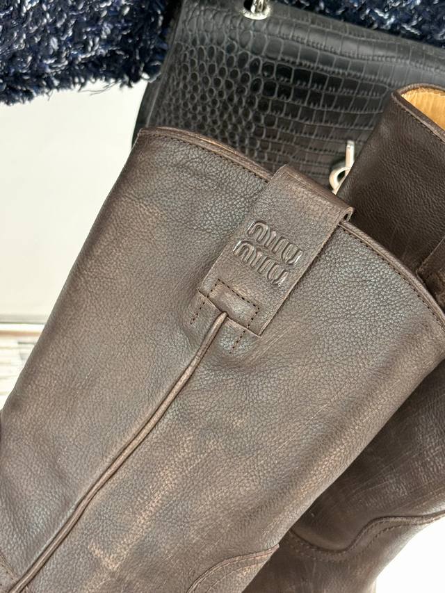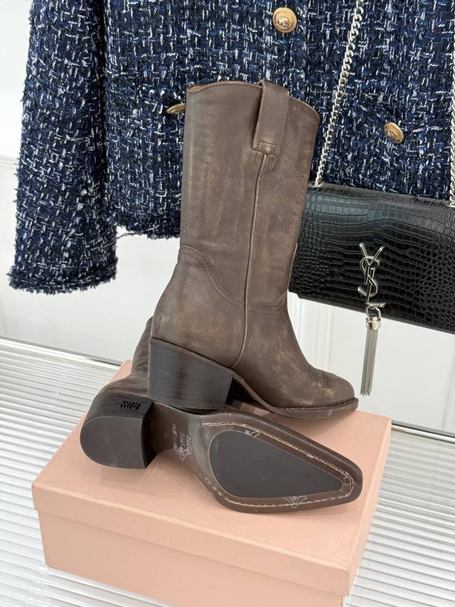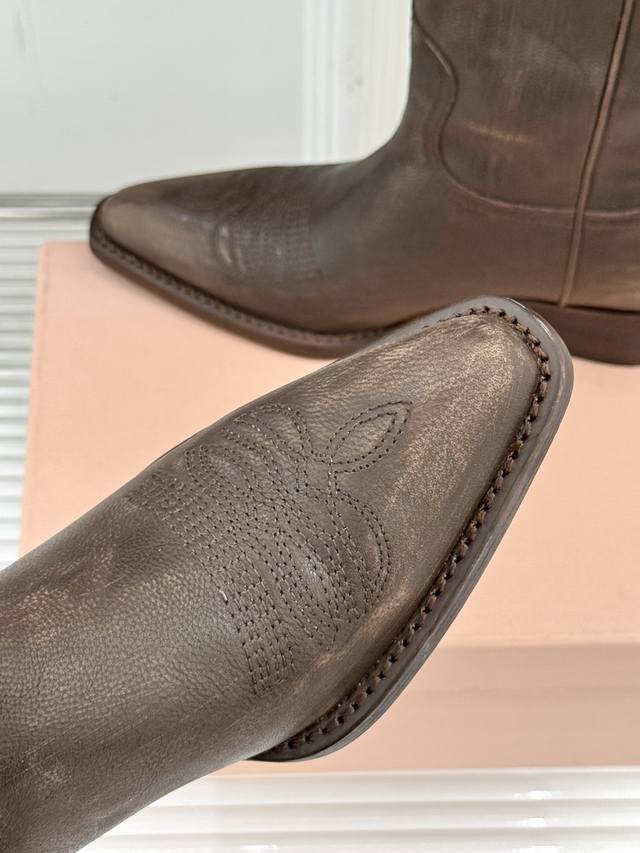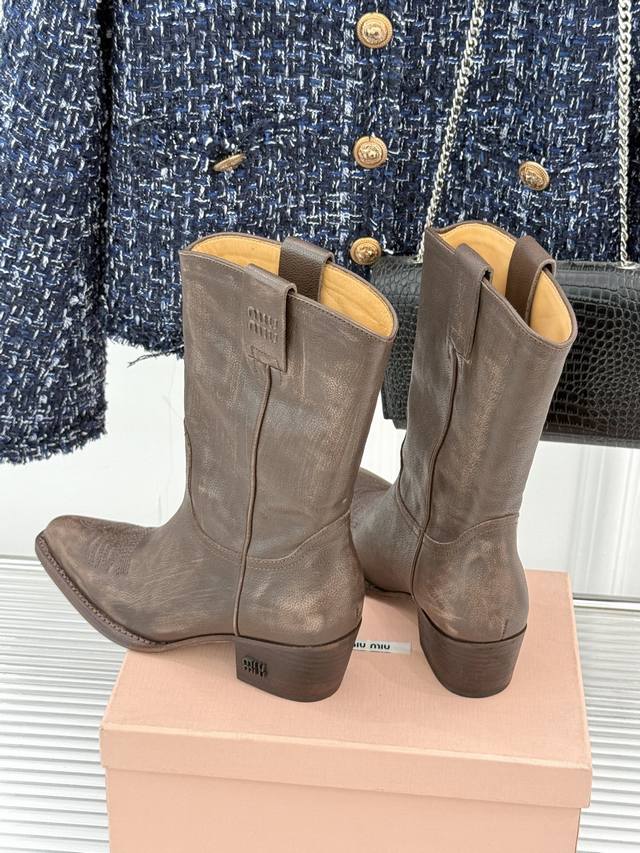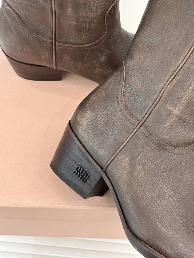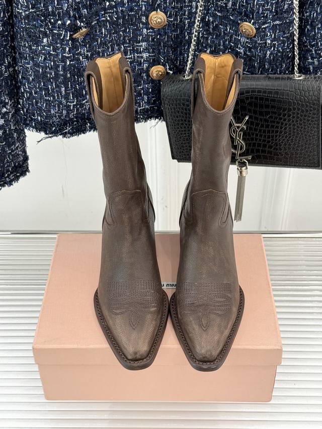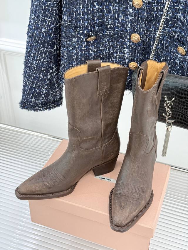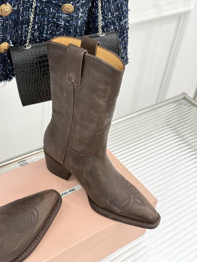 厂价 牛皮490 Miumiu 缪缪25Wf复古西部粗跟短靴 这双短靴把少女的甜与西部的飒揉成了极致浪漫 标志性的西部风缝线勾勒靴身 自带复古滤镜 鞋头或缀金属