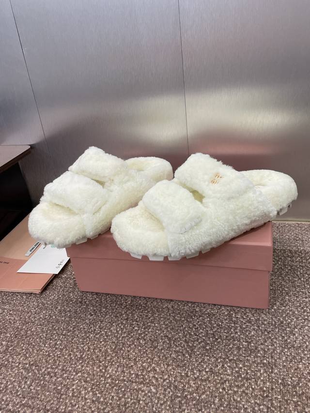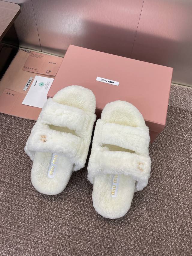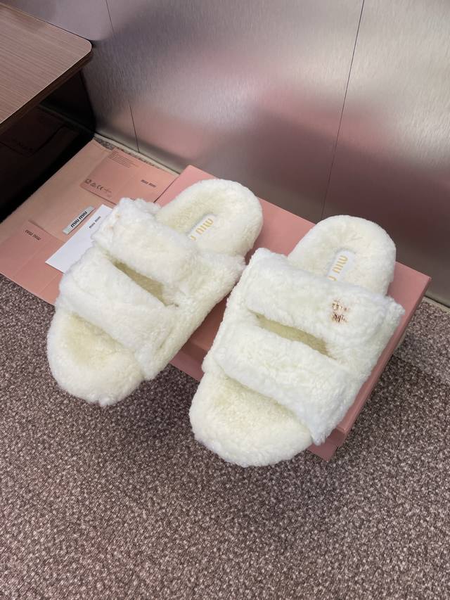 / 工厂p价p Miumiu 2025秋冬新款时尚魔术贴羊羔毛女拖鞋 缪缪字母Logo平底圆头拼色露趾居家鞋 材质:进口羊羔毛+原版开模防滑耐磨橡胶大底 Size: