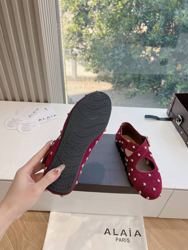 所见即所得g002代购级别原版购入法国一线奢侈品牌alaia 阿莱亚2025Ss法式仙女芭蕾舞平底跳舞鞋,Alaia品牌源自其创始人,Azzedine Alaia是上世纪80 年代“超紧身性感”风潮的创始人,被称作“King Of Cling”, 他是时尚界最传奇的设计师之一 Azzedine Alaia 聪明地将性感一边更夸张,既清醒谨慎摩登,又超贴身性感铆钉、金属环扣、紧束胸衣和性感蛇皮,这些 Alaia 的设计元素仍不断出现在各大品牌的秀台上 Alaia品牌的风格一如其时装,性感而又摩登