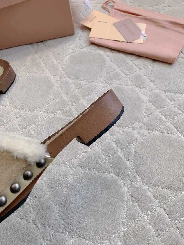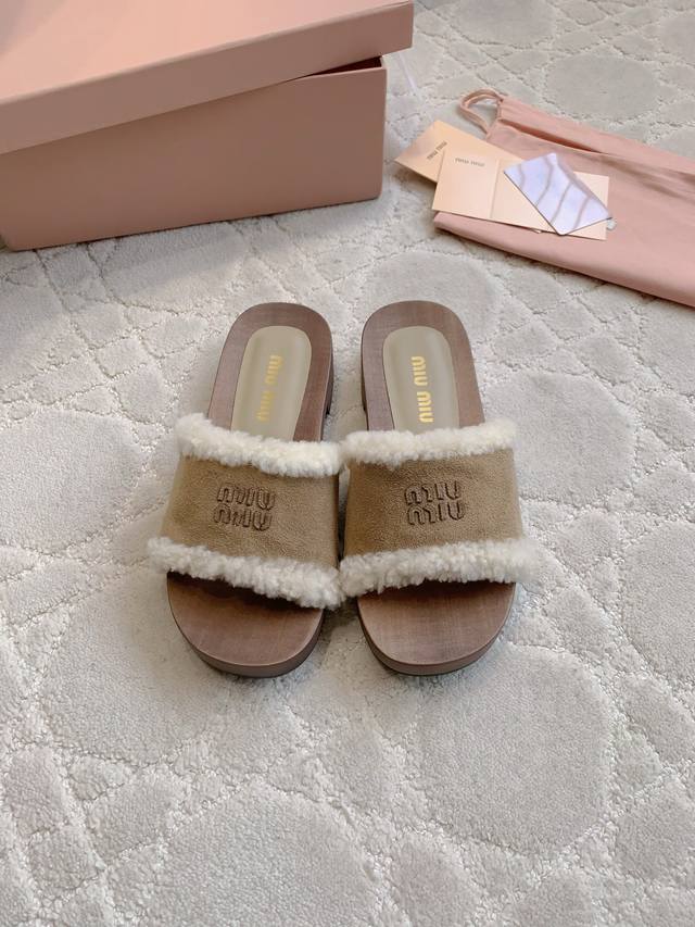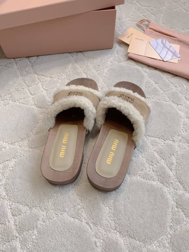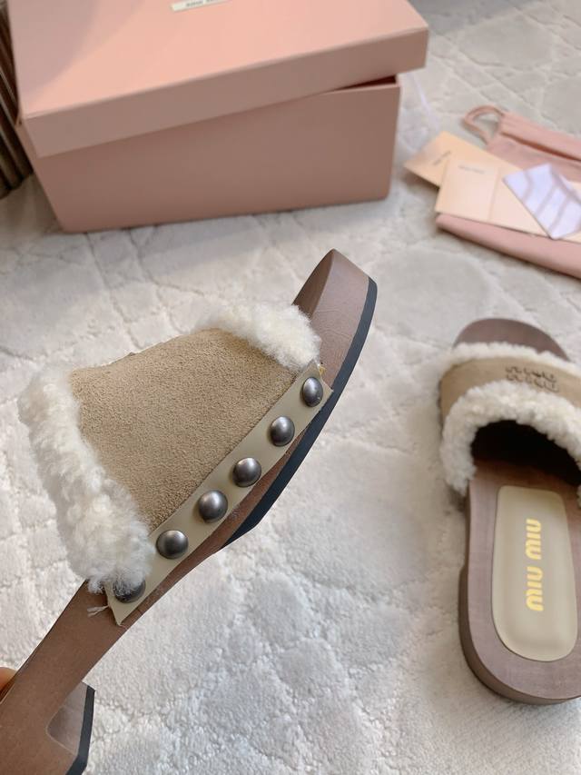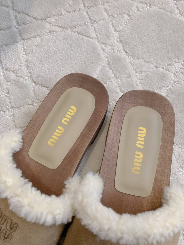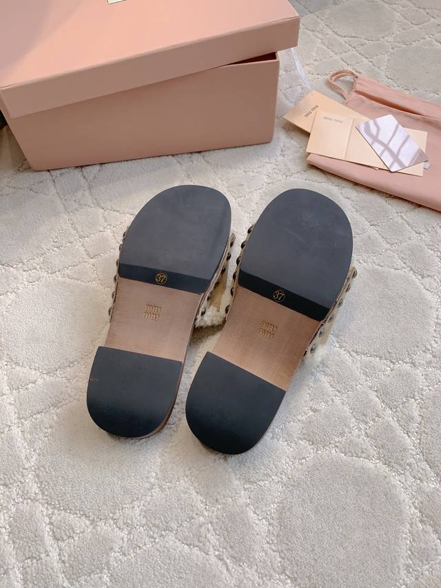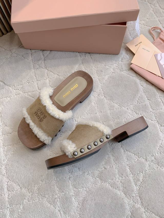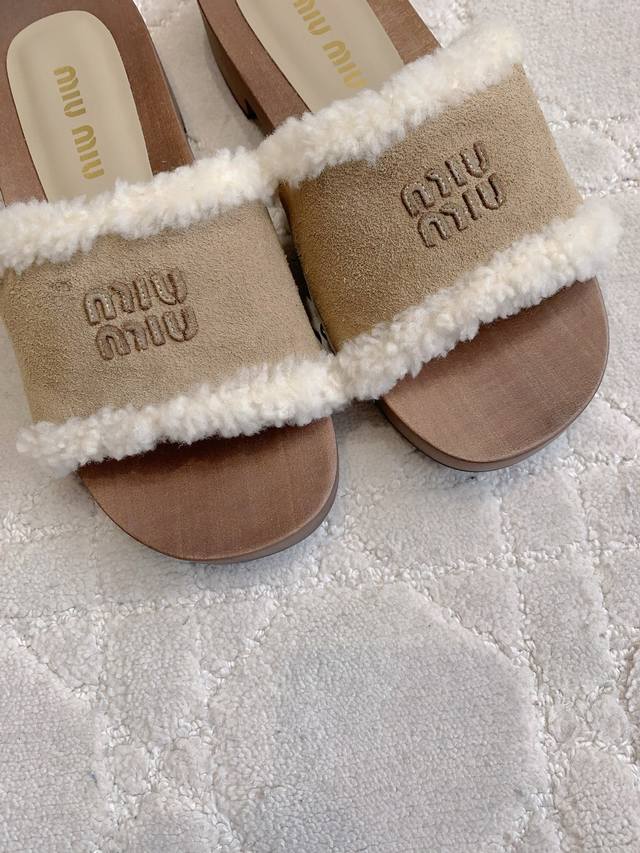 拖鞋 包头 Miu新款麂皮羊毛拖鞋 引领新时髦 Miu里Miu气轻松拿捏 上脚真的超好看 简约中不乏亮点 流淌出一丝带甜的层次氛围 鞋面牛皮加羊毛 内里垫脚羊皮