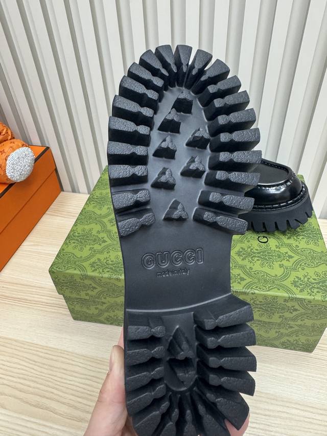 始创于1950年代的原版品牌细节在这双鞋上浪漫新生。取材自马术世界的条纹织带已经成为高雅俱乐部的象征,正在以新的方式重新登场。这款乐福鞋采用亮面皮革制作,搭配橡胶沟纹鞋底。