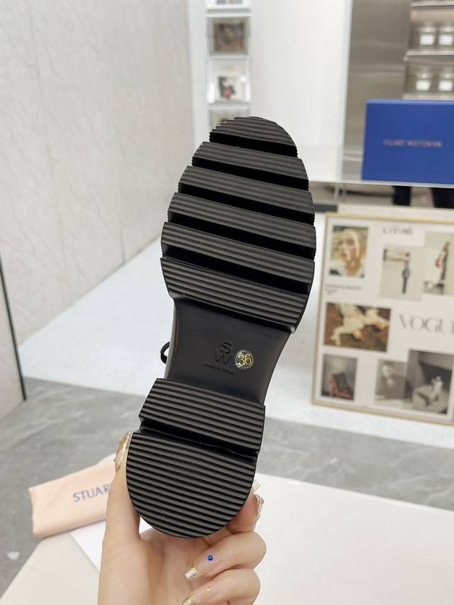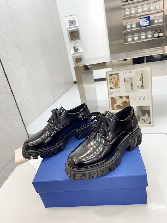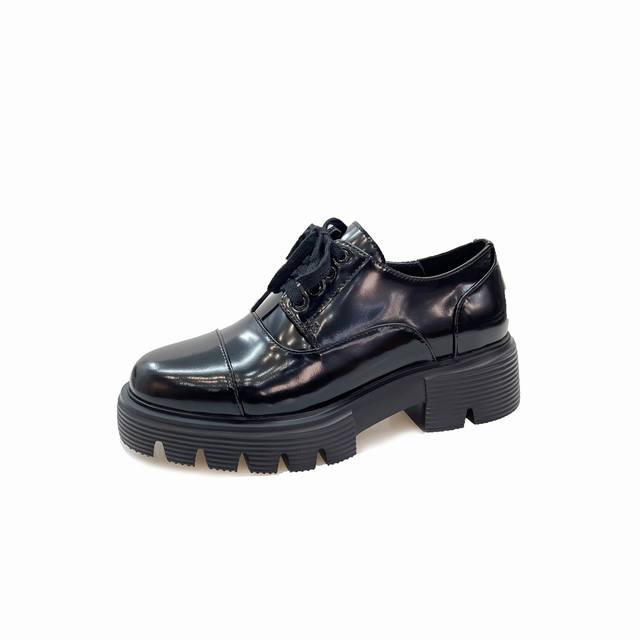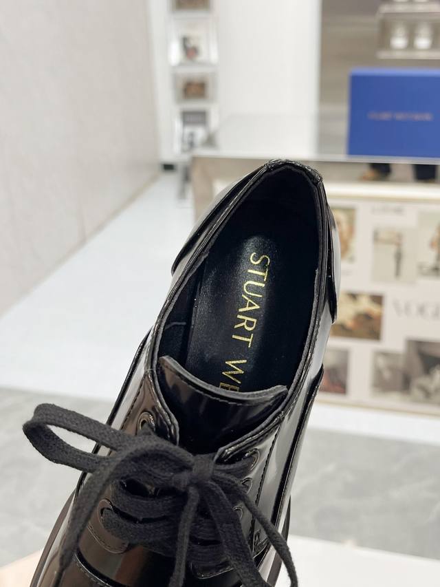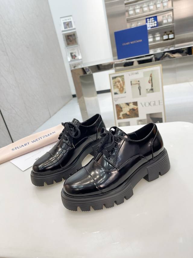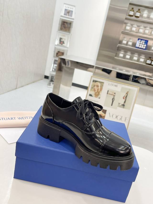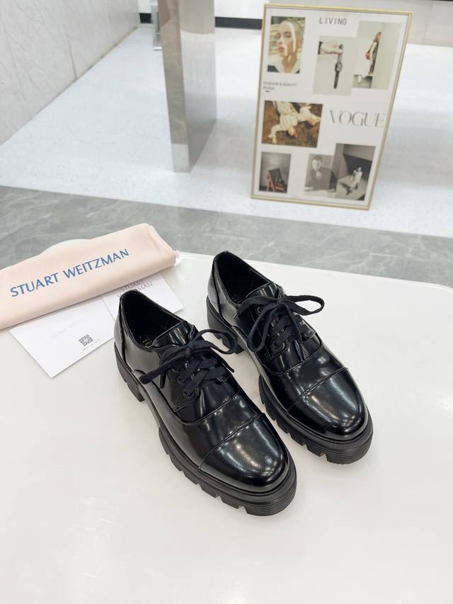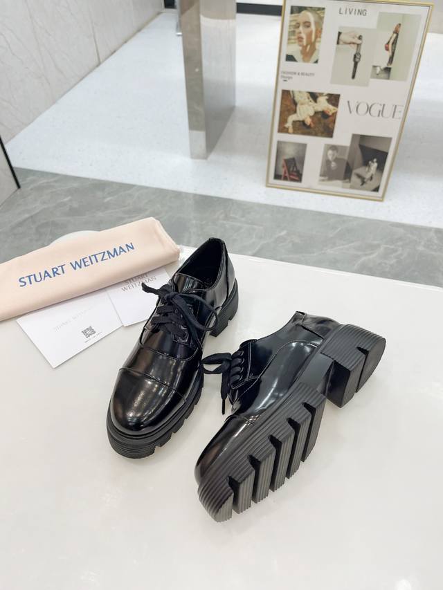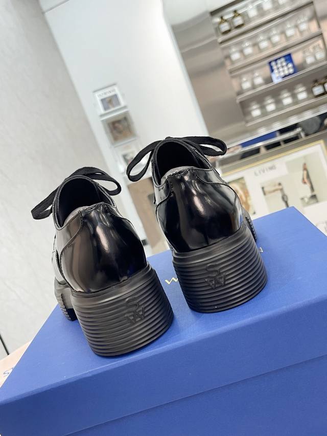 新款sw 乐福鞋女松糕厚底 系带英伦圆头百搭浅口 亮面粗跟 跟高4Cm 面皮 开边珠 内里垫脚 羊皮 码 34-41 34 40 41订做 P