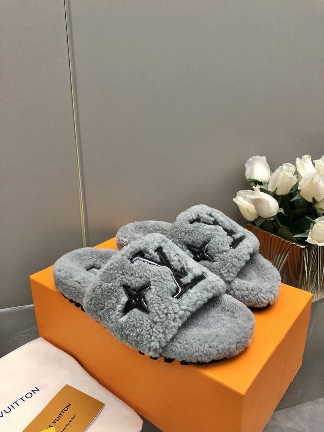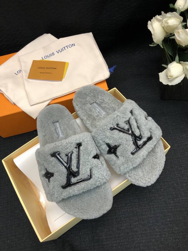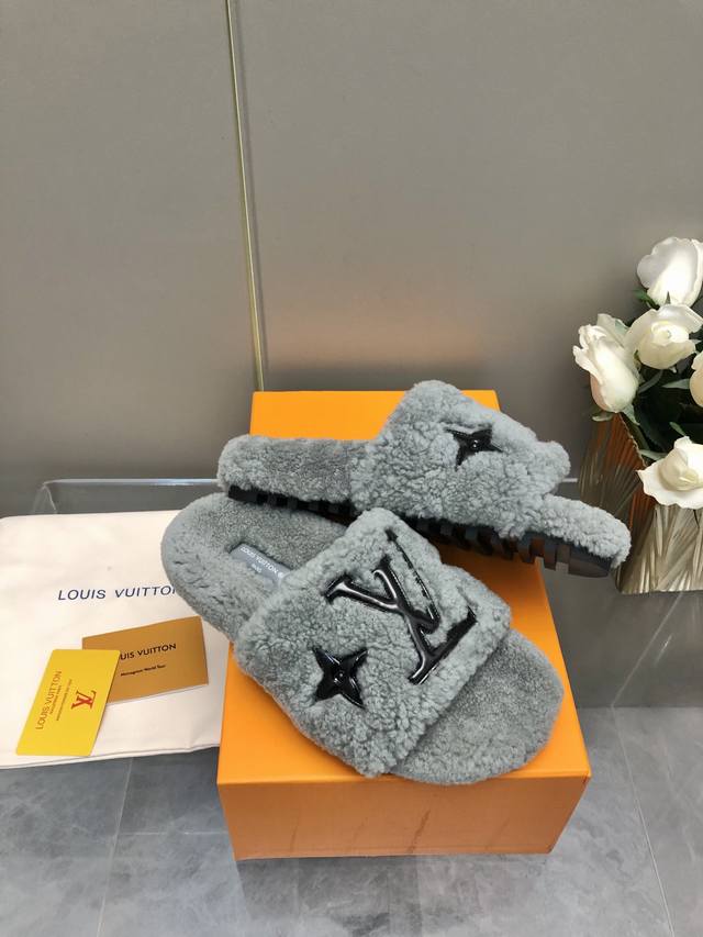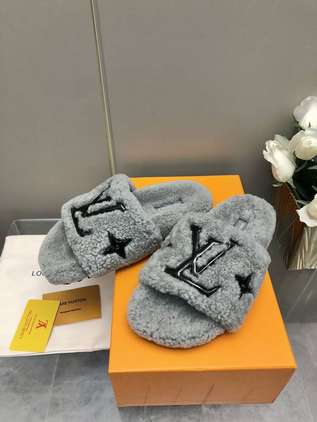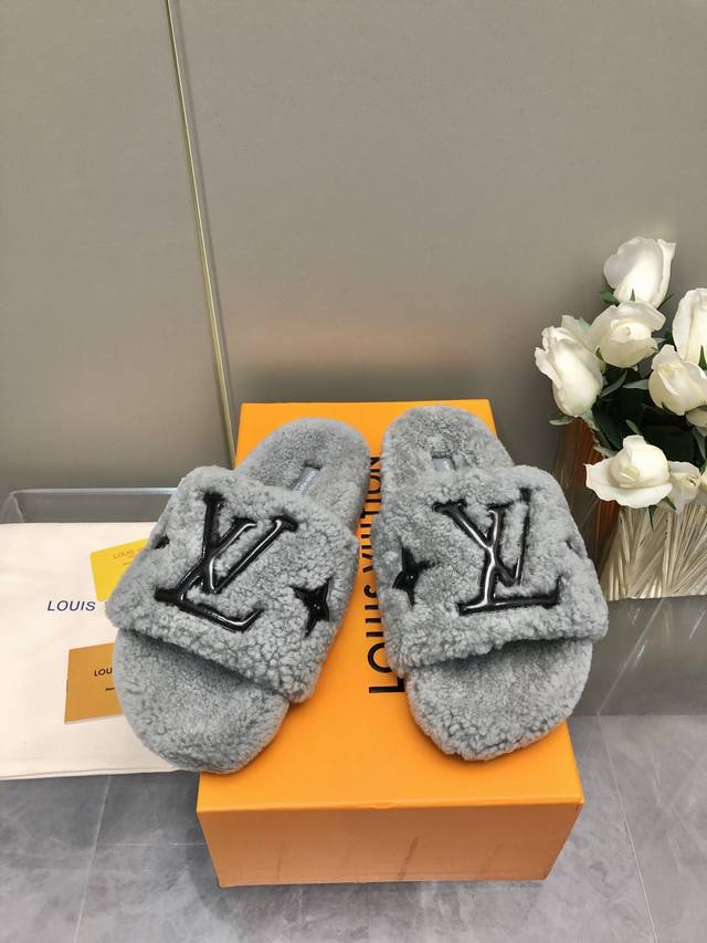 / 新色2024- 24新升级鞋面羊毛拖鞋頂级品质纯皮毛一体羔羊毛打造!米超温暖的感觉,穿上仿佛踩在云朵上经典老花装饰,精致高级!让这双毛拖身价陡增!鞋底是原版开模