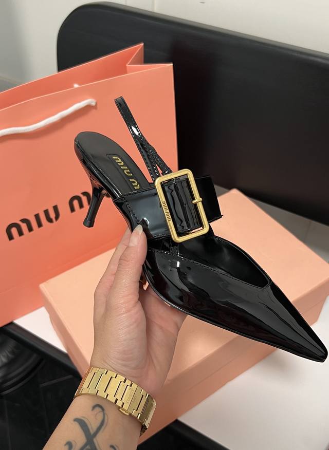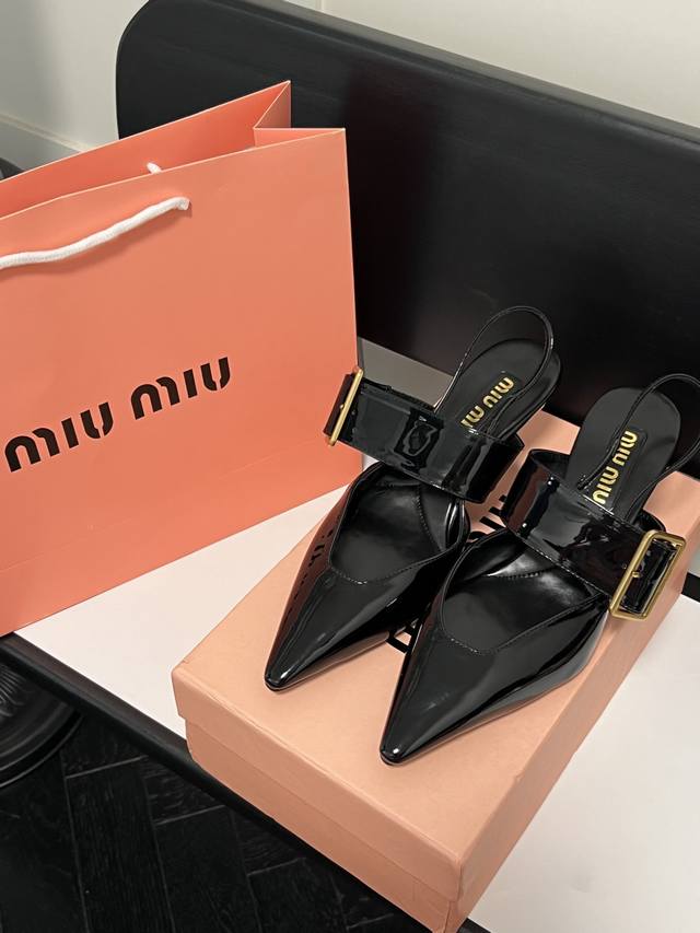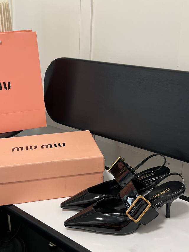 Miumiu 缪缪2024早春新款 漆皮尖头高跟凉鞋 高跟鞋 猫跟后空凉鞋