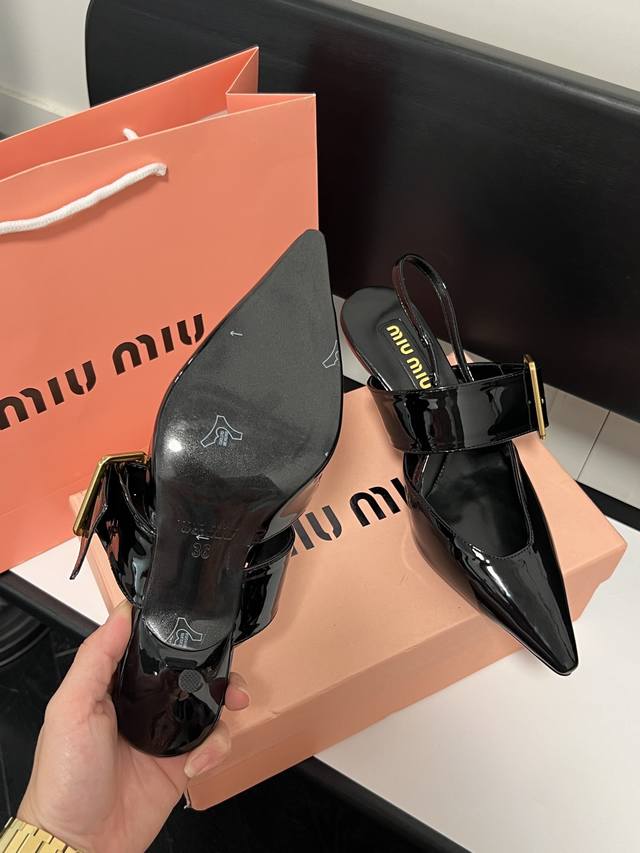 橙子出厂价Miumiu 缪缪2024早春新款 漆皮尖头高跟凉鞋 高跟鞋 猫跟后空凉鞋跟高:5Cm码数:34-41