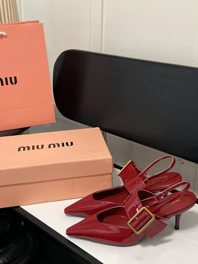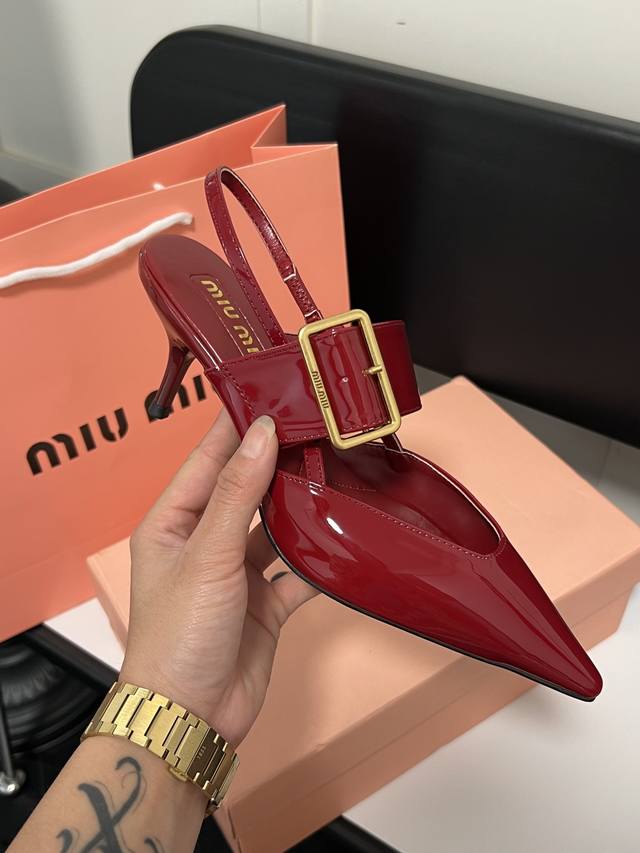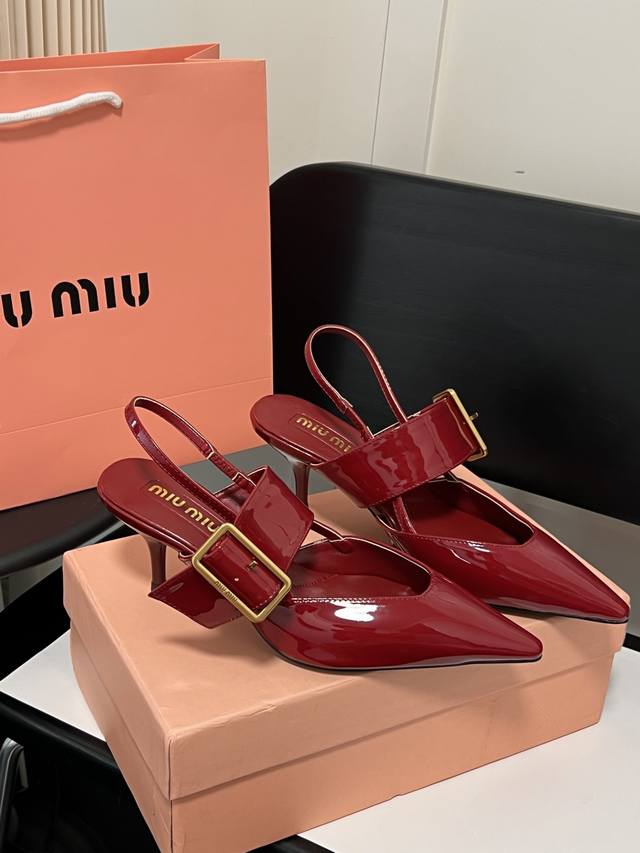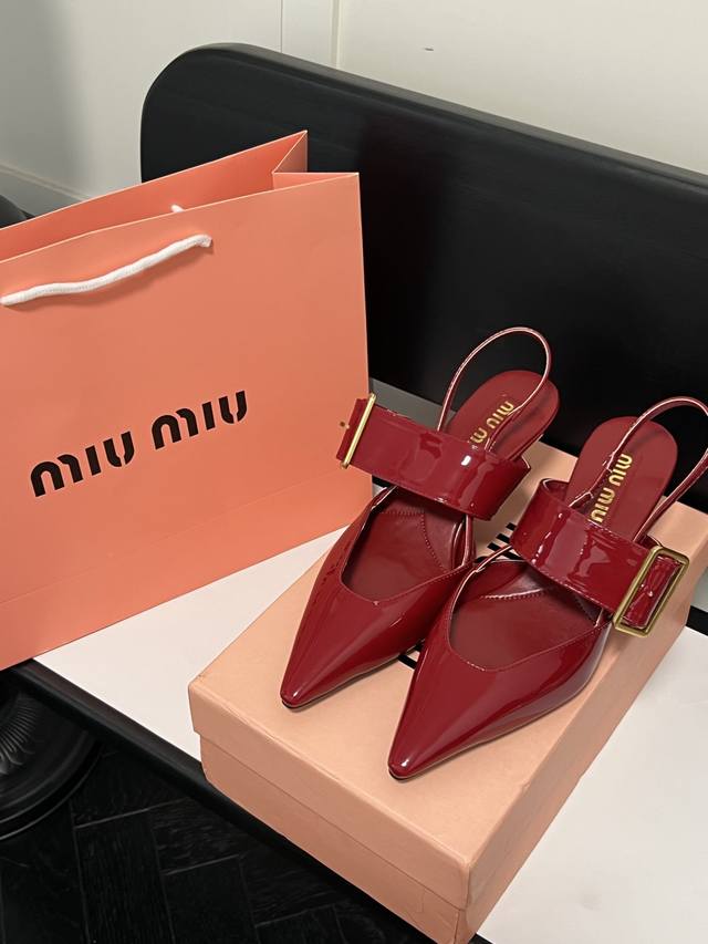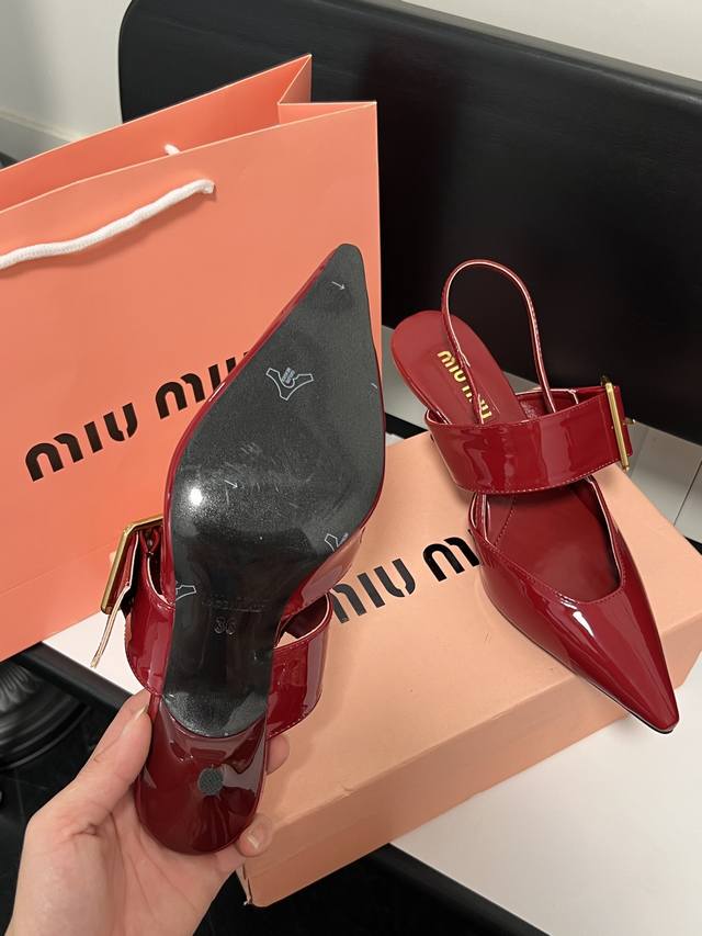橙子出厂价Miumiu 缪缪2024早春新款 漆皮尖头高跟凉鞋 高跟鞋 猫跟后空凉鞋跟高:5Cm码数:34-41