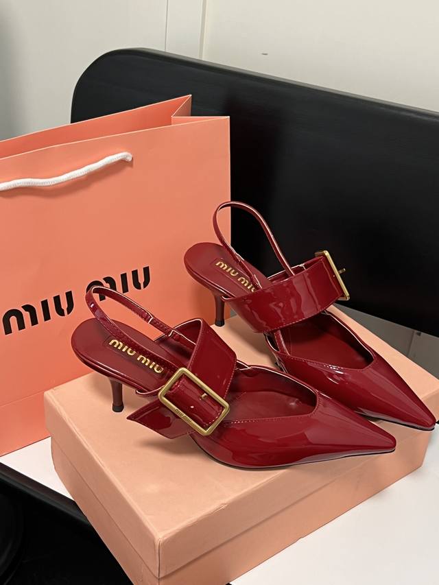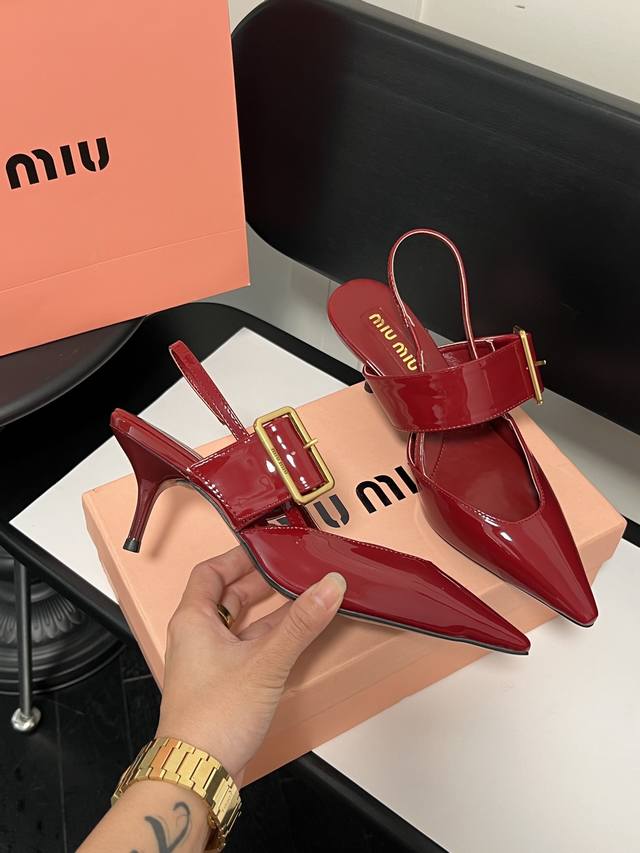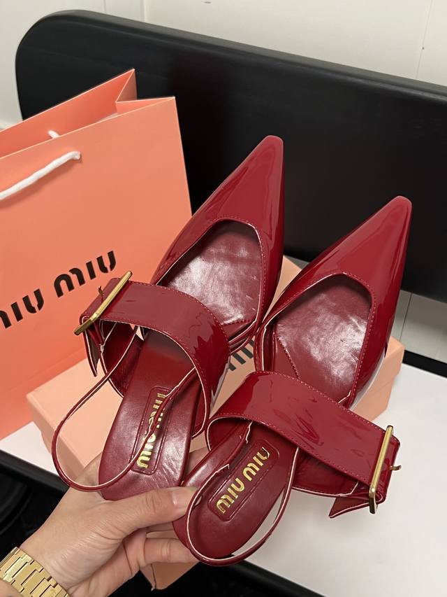 Miumiu 缪缪2024早春新款 漆皮尖头高跟凉鞋 高跟鞋 猫跟后空凉鞋