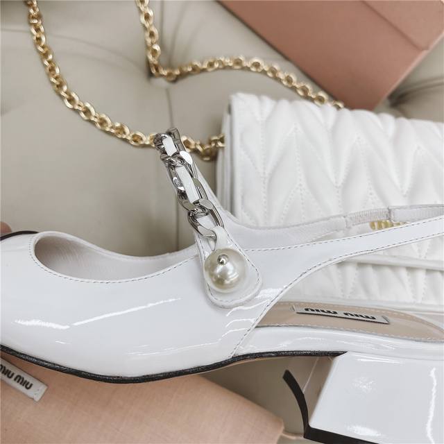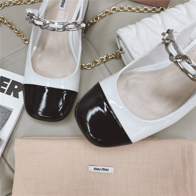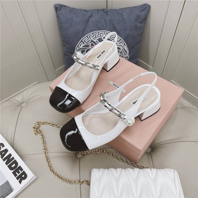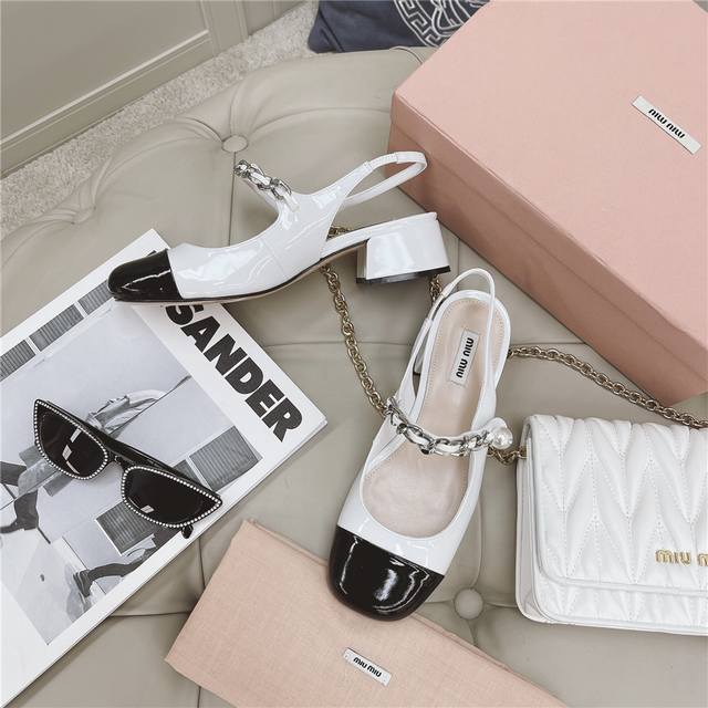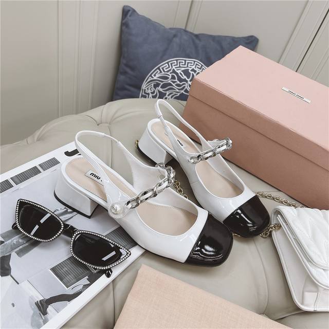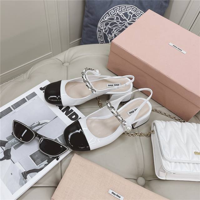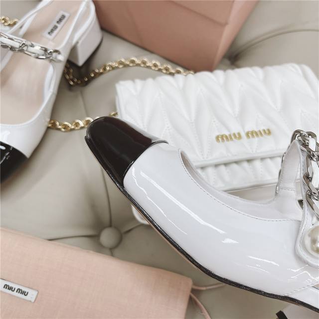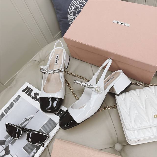 / 橙子出厂价P Miumiu 缪缪 早春新款 珍珠玛丽珍鞋 浅口粗跟凉鞋 黑白撞色,方头设计,唤醒了60年代魅惑剪影。撞色设计风格鲜明,链条装饰的饰带加大珍珠等精