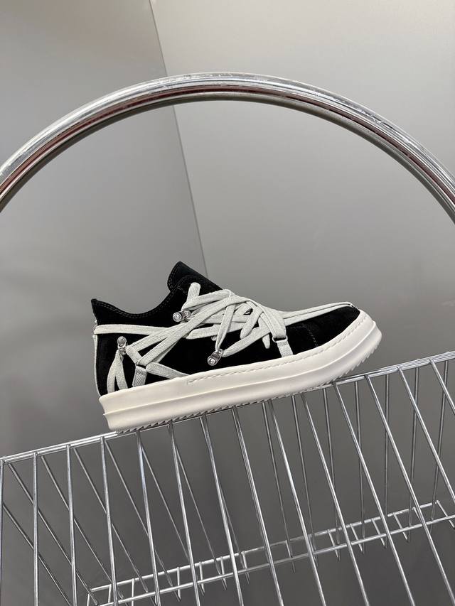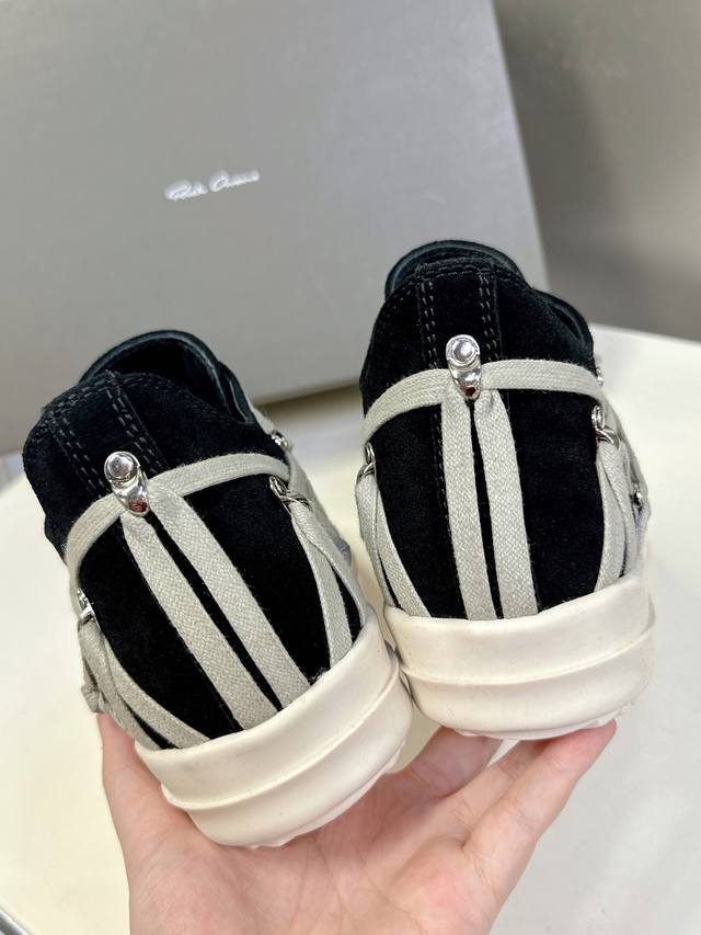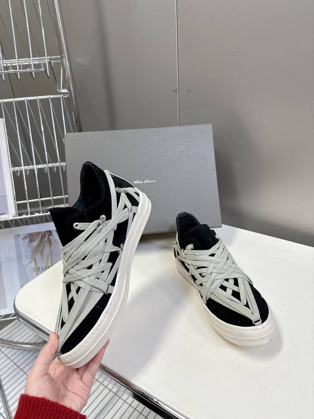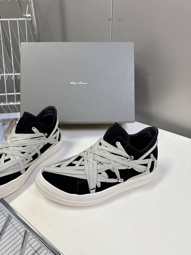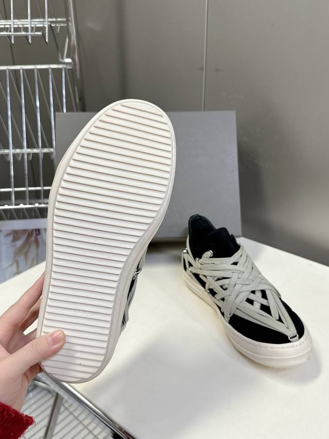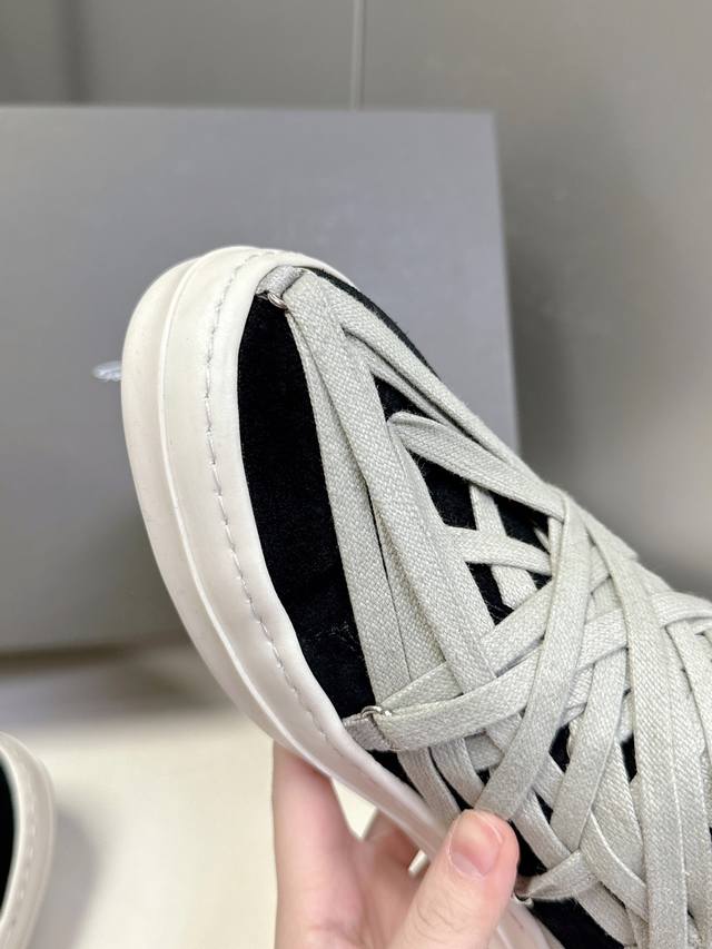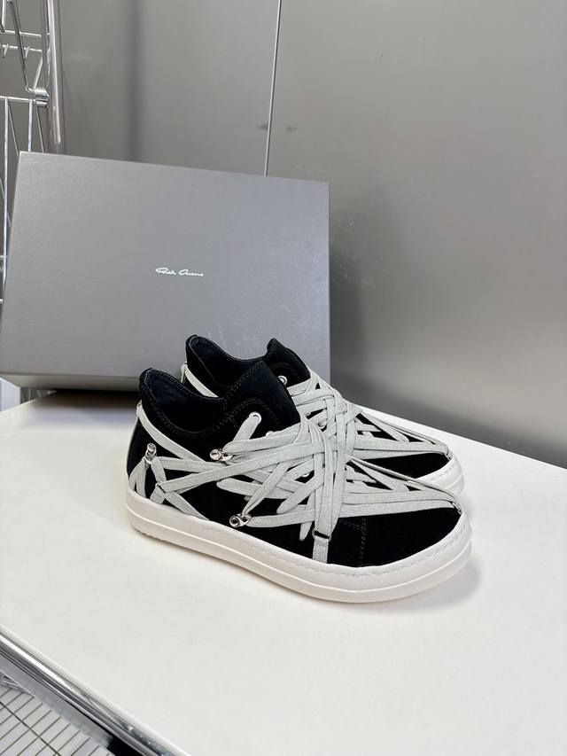 Rickowens 欧文斯疯狂绑带鞋 麂皮黑色 年度“鞋王”区分市面所有版本 纯手工打造纯原,非流水化作业的产物!尊崇欧文斯的理念,每一只都是独一无二,有手工质感的味道!奶香大底、进口小牛内里头层皮、牛皮鞋垫、手工车线!图片透露出的质感!Ms是不会糊弄人的 正品全套包装 Size:女35-40 男39-44