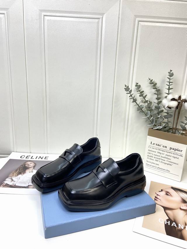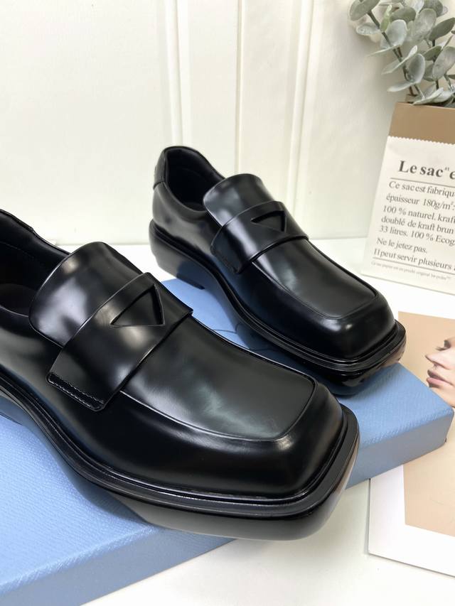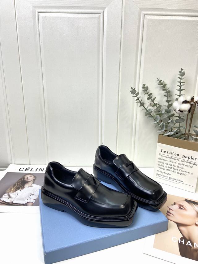 男20 顶级版本 prad*中性风厚底乐福鞋 男女同款 上脚酷帅有型 后跟三角标的设计很精致 鞋面原版进口开边珠牛皮 内里垫脚进口水染牛皮 原版开模大底 女码3