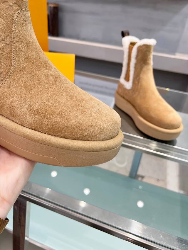 面料:采用进口高丝光牛猄皮面压花lv 字母和monogram 花卉点缀,搭配皮毛一体毛条装饰松紧带,更显时尚,羊皮内里,进口高密度橡胶美耐底 高密度发泡材质填充 ,轻盈舒适,鞋底有一定厚度,增高效果也不错!精品
