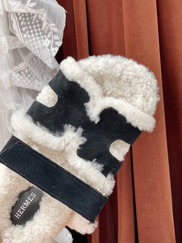 羊羔毛h二舅拖鞋 绝了好看呀 秋天必备,不用顾忌好穿与否 橡胶厚鞋底就是舒适,可调节裆带也妥妥的兼顾裸脚穿、 薄袜子穿.厚袜子穿场景 全毛: 鞋面材质:羊羔毛