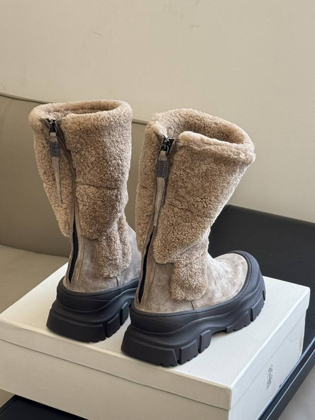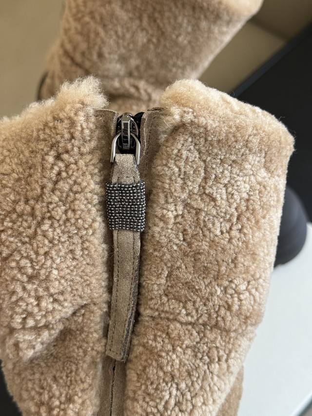 哑光小牛皮的均匀纹理与剪毛绵羊皮嵌饰的松柔质感组合,在民族灵感的细节中重新诠释经典靴款的量感。拉链祥上的一排排镶珠细线,最后以 Brunellocucinelli的纯正风格为靴子添增亮彩