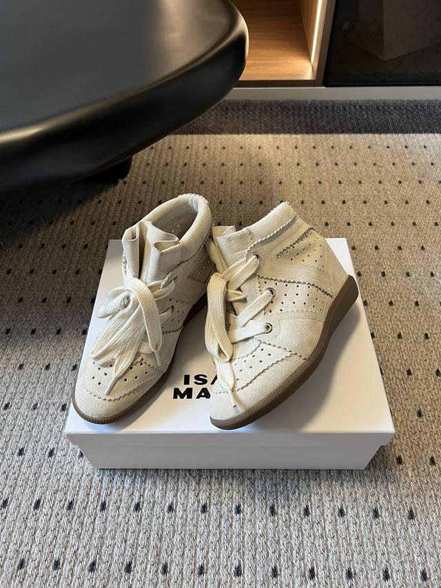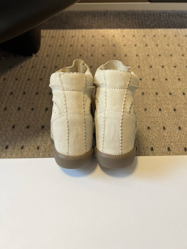 采用反绒皮材质,质感细腻且富有复古韵味;鞋面有镂空和波浪形缝线设计,细节精致,增添层次感。高帮款式能修饰脚踝线条,内增高设计可在视觉上拉长腿部比例,同时保证穿着舒适度,兼具美观与实用性。