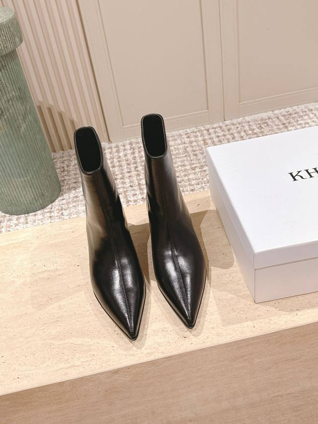 / 顶级版本:不带拉链 :Khaite 25秋冬新款尖头短靴 小粗跟搭配件头,气质又好穿 靴口有点斜切设计,新颖不单调! 好看好看,也很好穿搭,爱了爱 后拉链设计