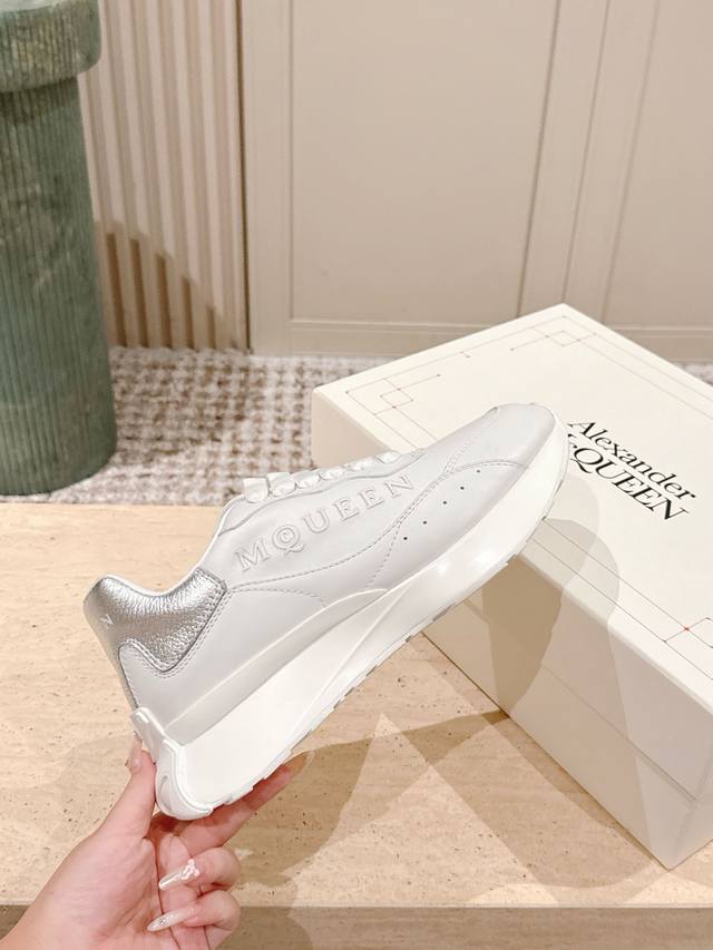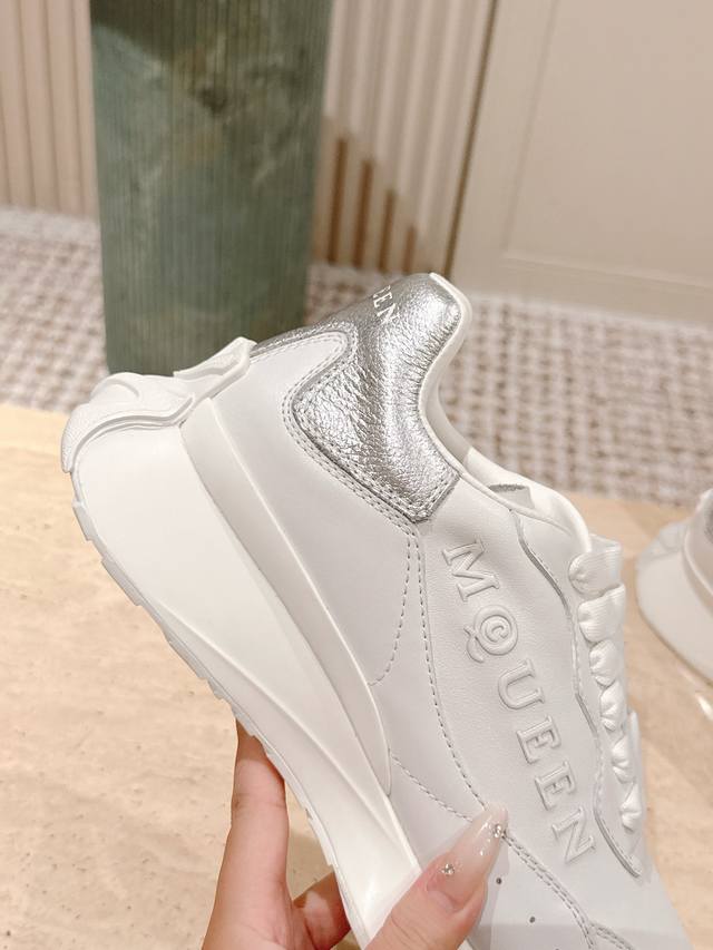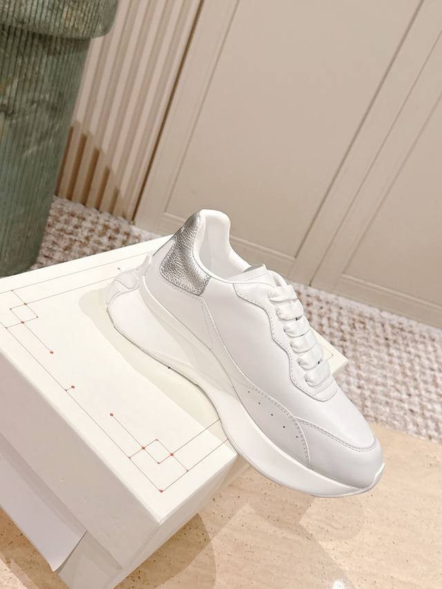 原版购入开发 做货 Sprint运动鞋一 采用白色皮革拼接鞋面设计。侧面点缀经典Mcqueen标志,金属质感银色鞋后跟饰有压印标志。搭配柔软的橡胶鞋底