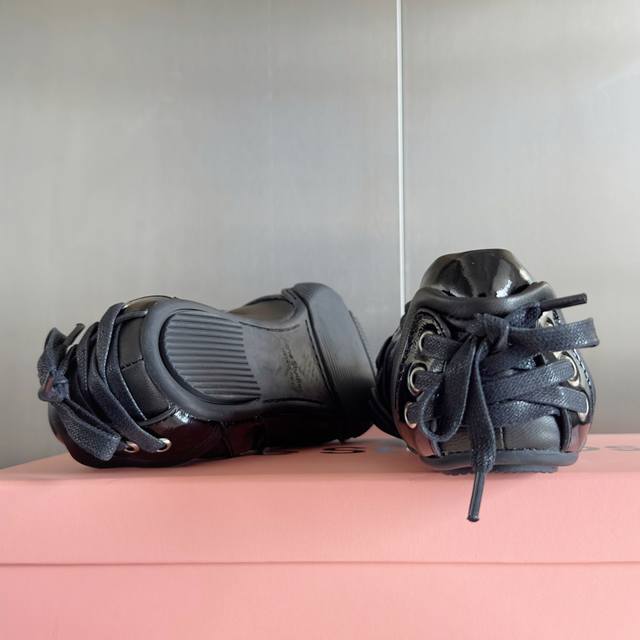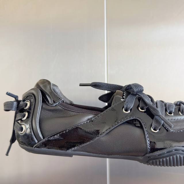 原版购入开发 做货 绑带鞋重新构想了芭蕾舞鞋的轮廓,采用牛仔风格的饰面和后部的装饰性系带 厚鞋底采用橡胶和皮革制成