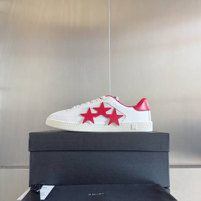 Amiri的pacific鞋是一款兼具奢华和街头风格的运动鞋,其设计和做工非常考究 采用高级皮革制成,触感柔软,耐用性强,呈现高端质感 鞋面装饰了 Amiri经典的星星贴饰,边缘涂漆工艺增添细节感 配备立体的ma四重字母组合外底,既有视觉冲击力,又增加品牌辦识度