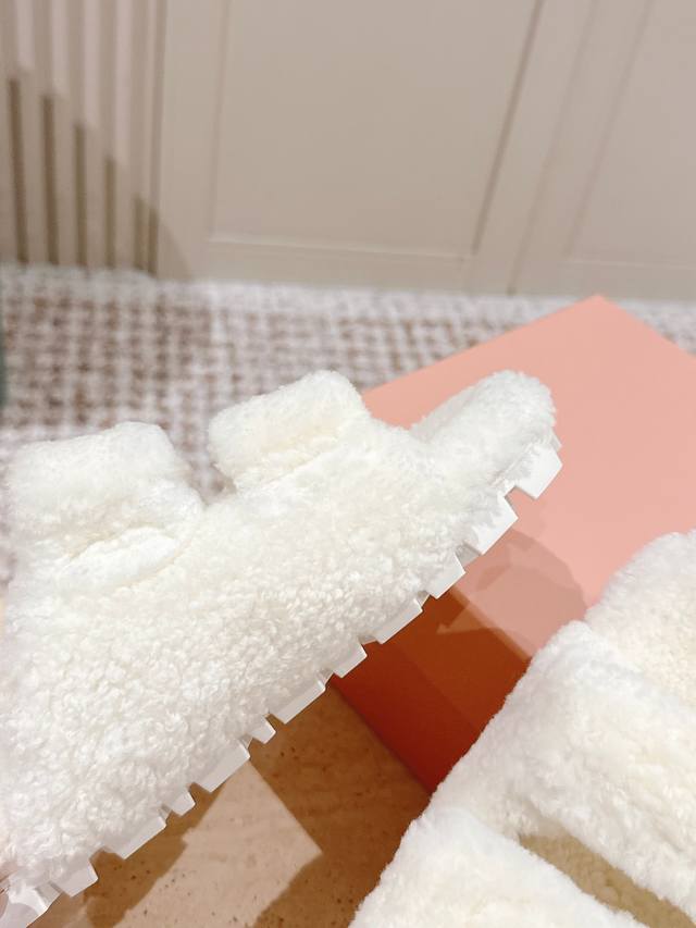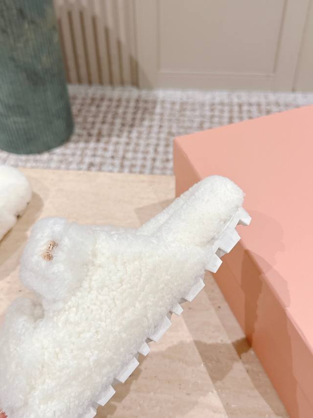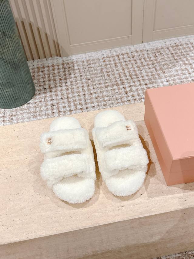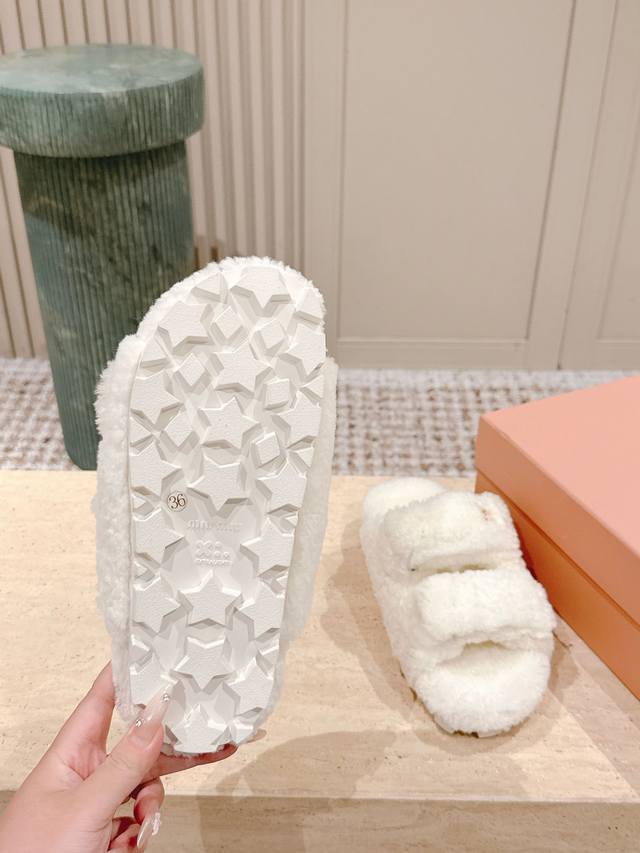 顶级版本: : Miu Miu 缪缪秋冬新款毛拖 百搭时髦单品!不管居家还是外穿都是品味的象征性!秋冬搭配袜子 那更是太绝太绝了 进口澳洲真羊毛,手感细腻柔软丝滑 大底是成型防滑底