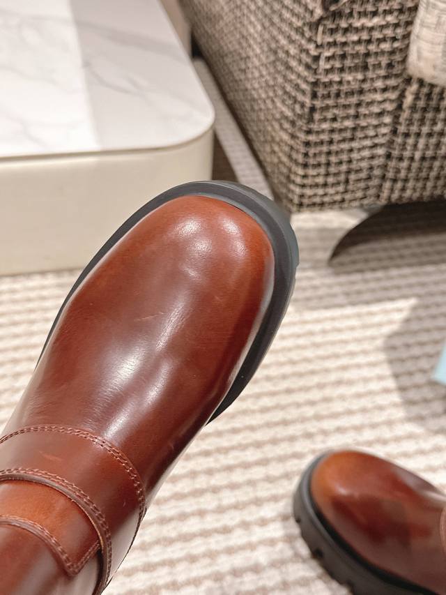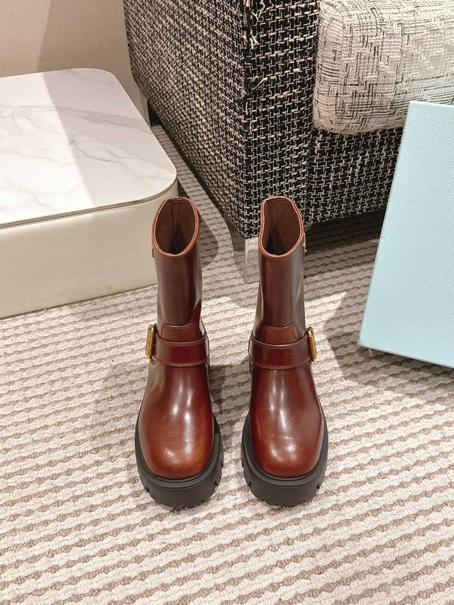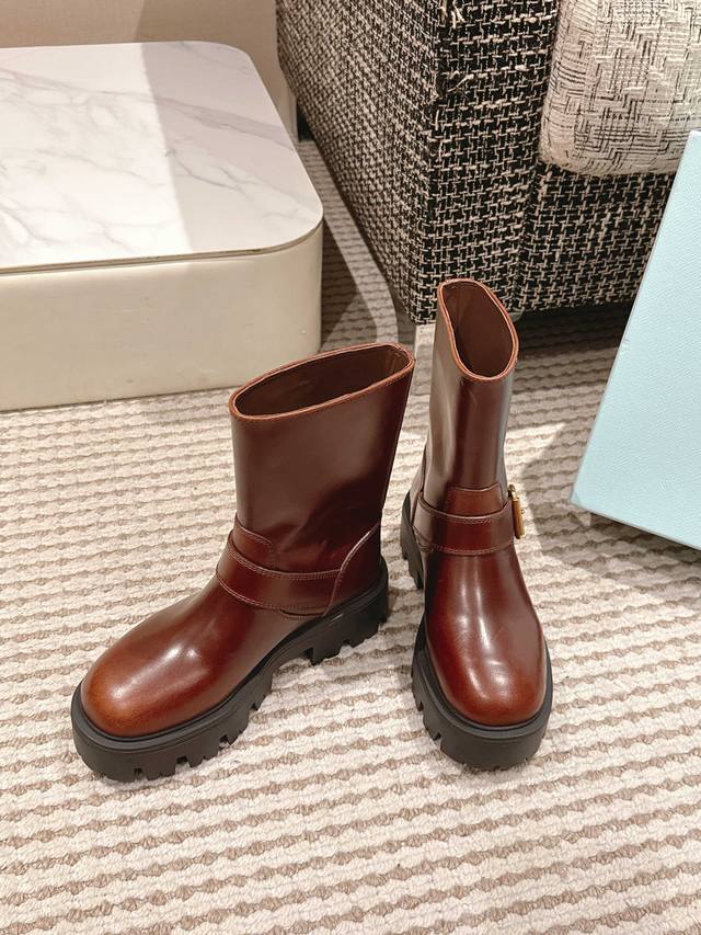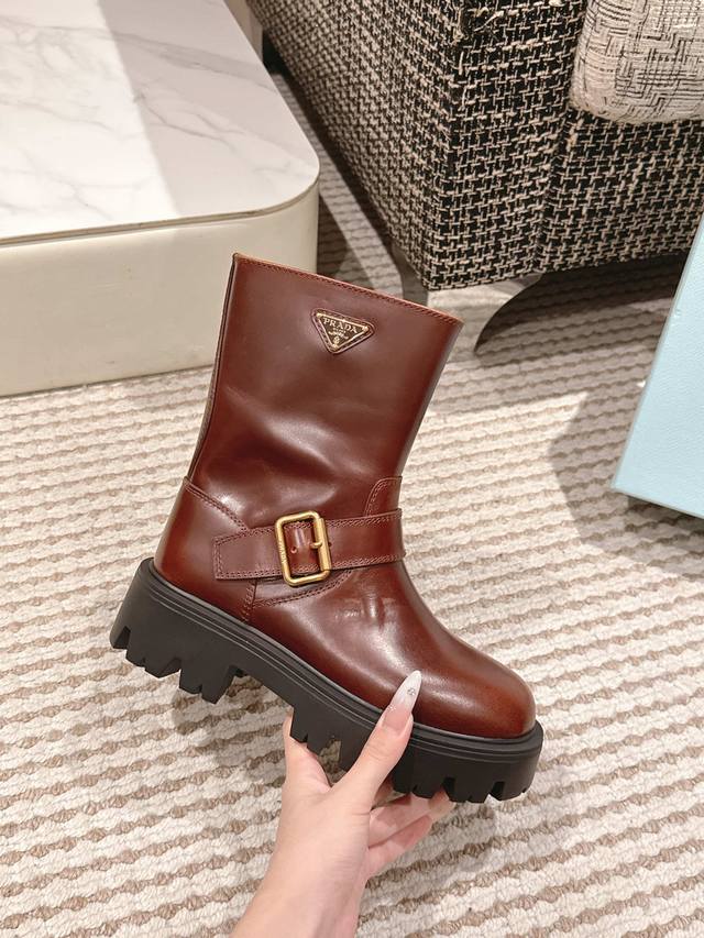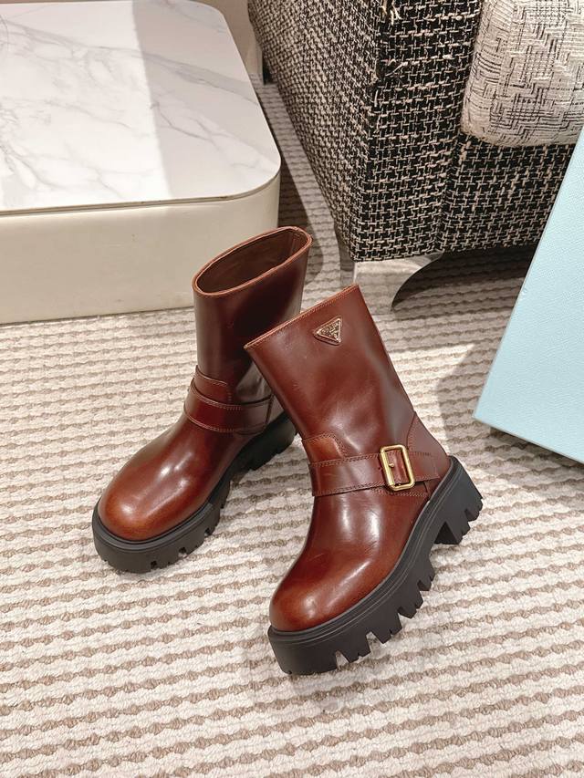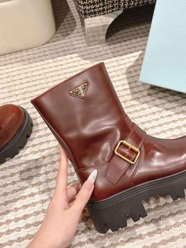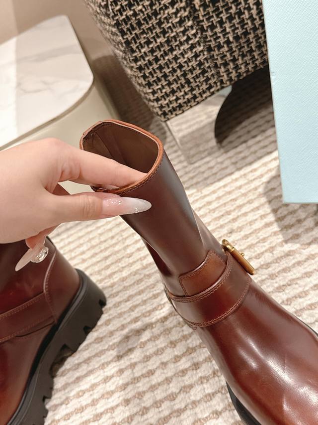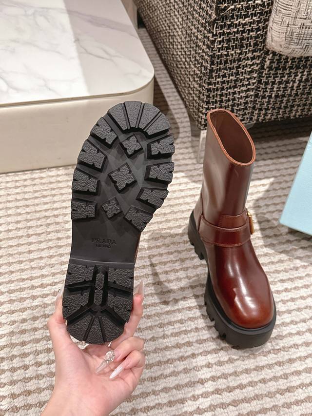 顶级版本 prada 2025秋冬新款经典三角标厚底一脚蹬短靴! 精致线条与工艺构造定义此款皮革短靴,饰有标志性三角形徽标,独特的金属搭扣为机车风格增添个性!