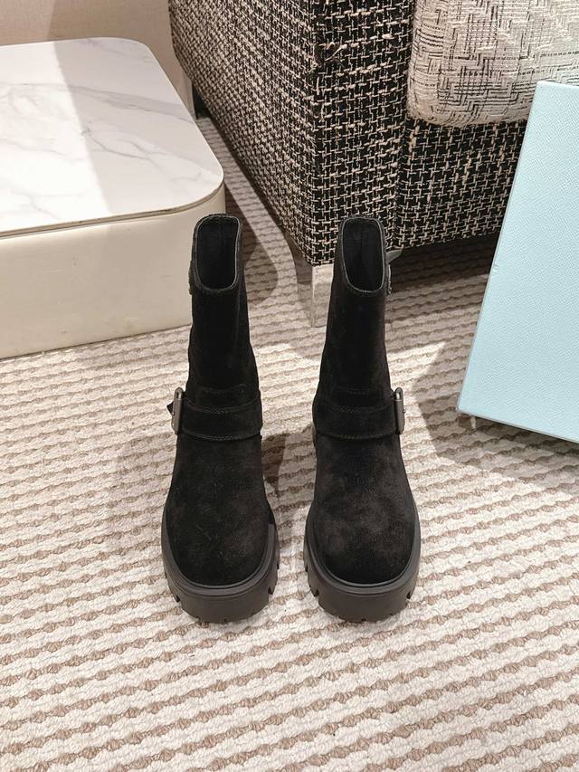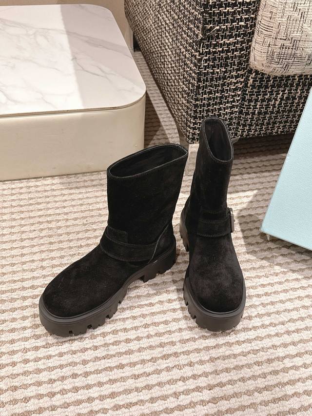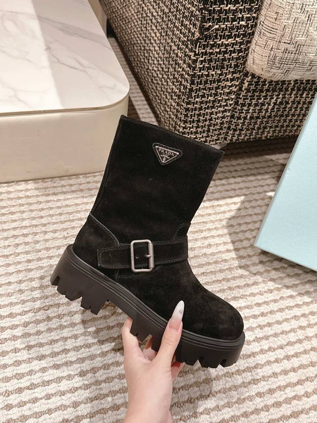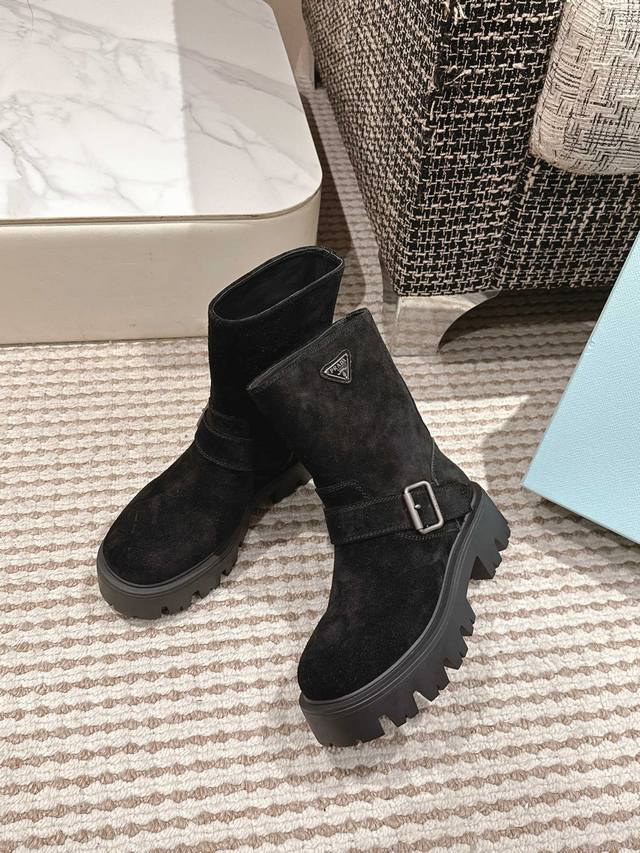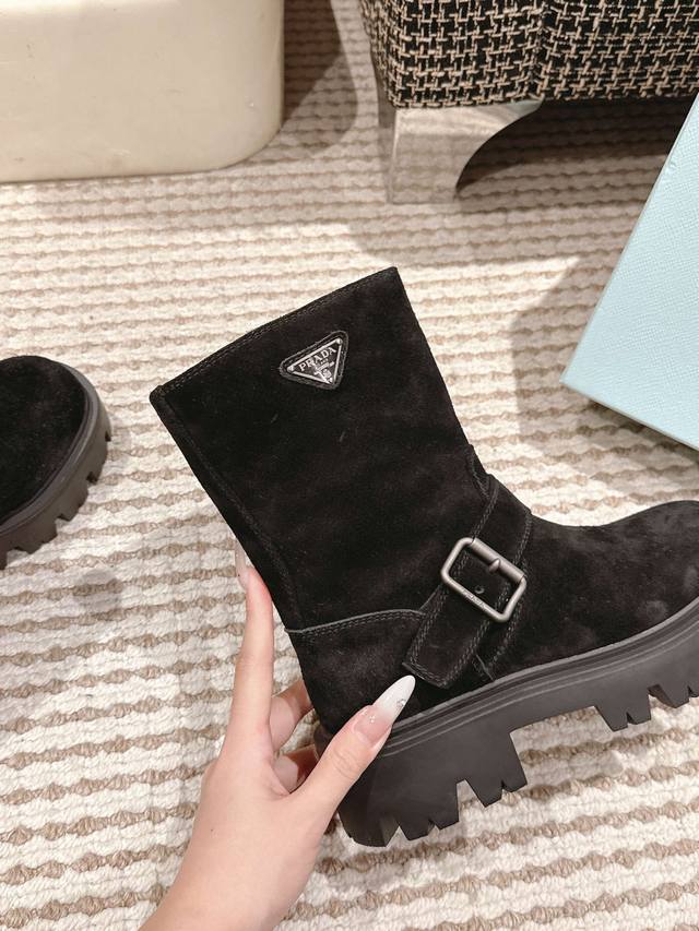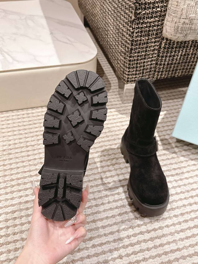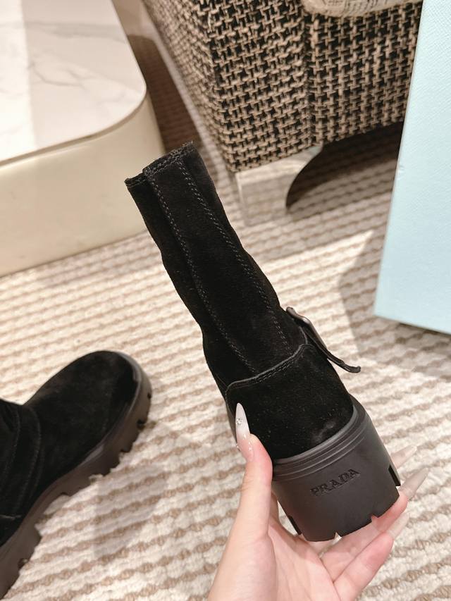 prada 2025秋冬新款经典三角标厚底一脚蹬短靴!