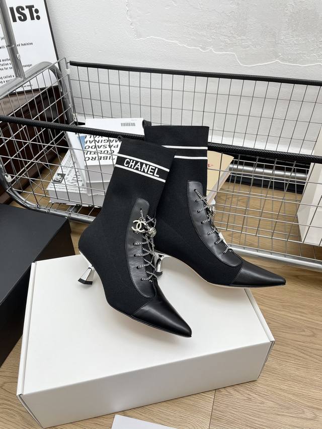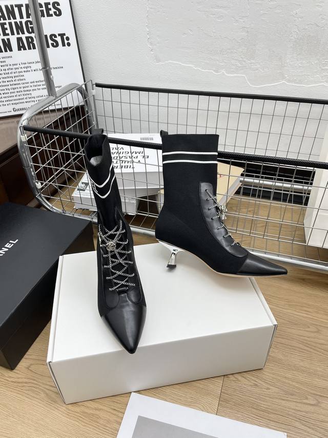 / 顶级版本chane* 小香24Ss秋冬新品尖头袜子短靴 帅气与舒适度于一体的单品鞋筒链条双c 点缀 优雅高级!细节工艺都无可挑剔的了! 鞋面:牛皮弹力筒 跟高: