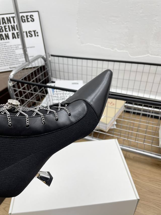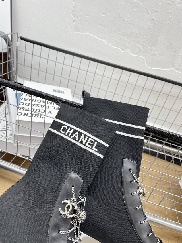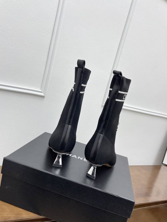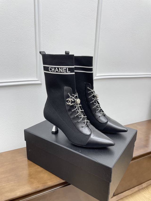 顶级版本chane* 小香24Ss秋冬新品尖头袜子短靴 帅气与舒适度于一体的单品鞋筒链条双c 点缀 优雅高级!细节工艺都无可挑剔的了! 鞋面:牛皮弹力筒 跟高: