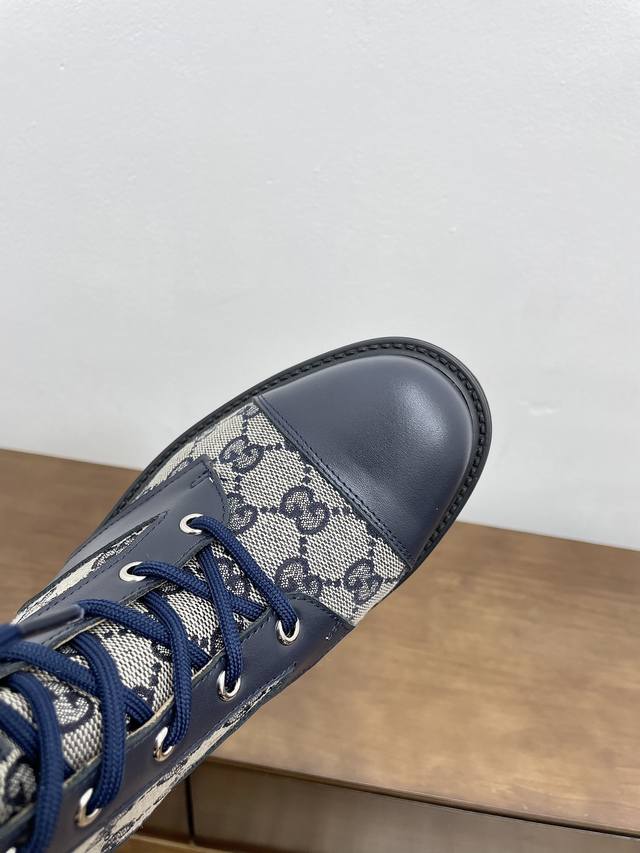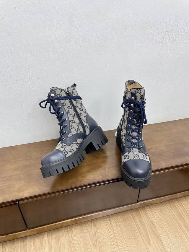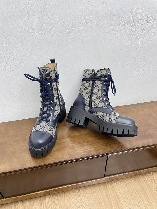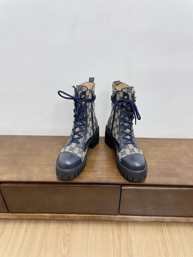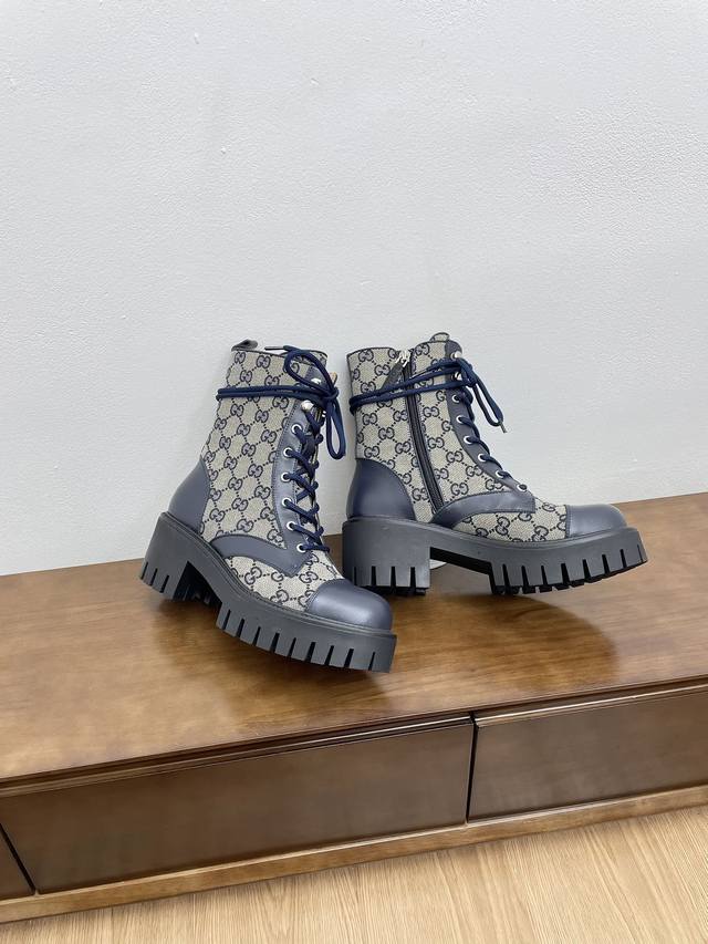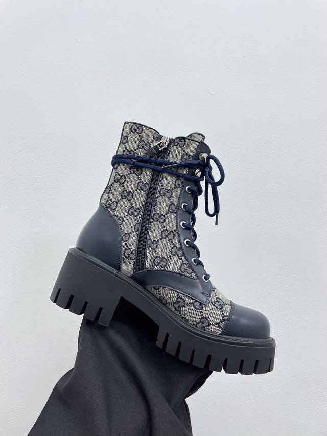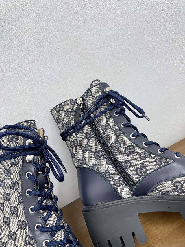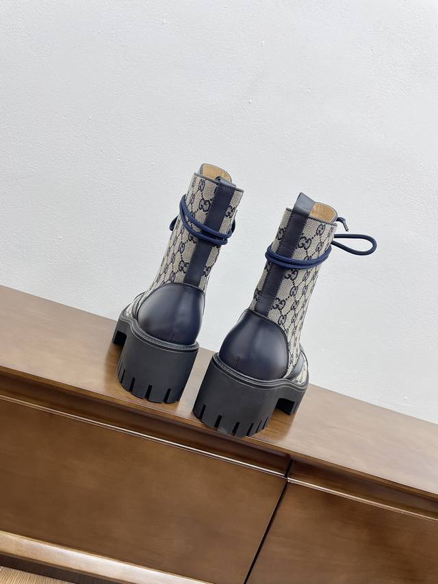 / 顶级版本gucc*经典爆款老花厚底系带短靴 百搭经典,辨识度高 鞋面:定制小牛皮拼接gg帆布 内里:水染羊皮内里 垫脚:羊皮 大底:原版开模大底 跟高:6Cm