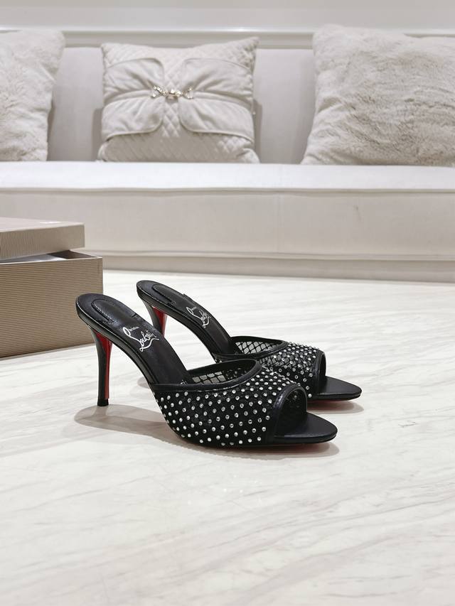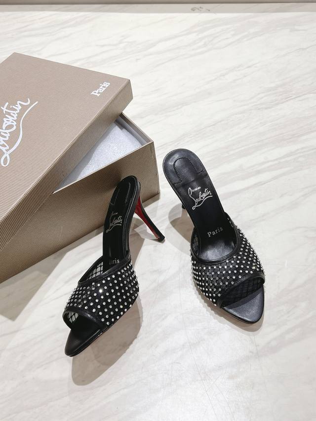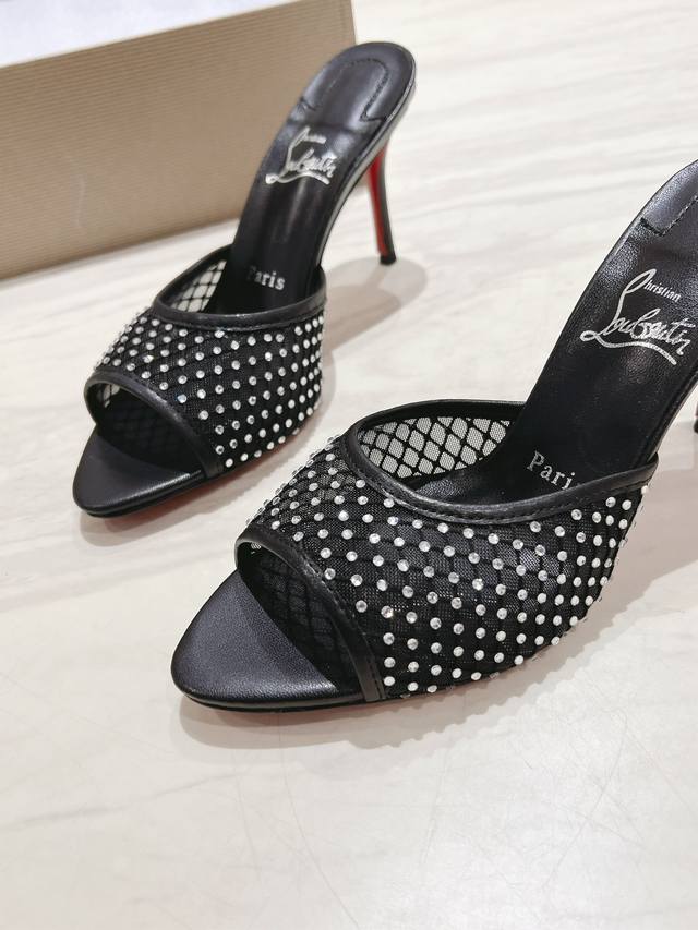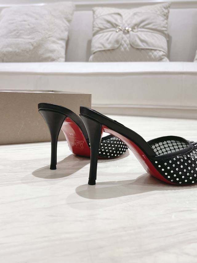 Christian Louboutin 2024S原版做货重工cl 经典apostropha Mesh Strass网纱高跟拖鞋~