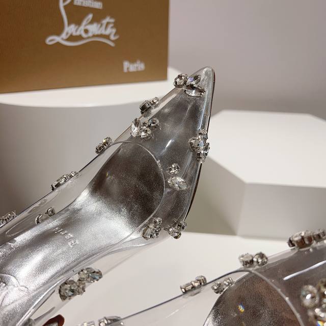 鞋面:采用透明的Pvc鞋面搭配最新款硕大醒目的施华洛水钻纯手工缝制,富贵迷人,妥妥的宝石仙女高跟鞋,