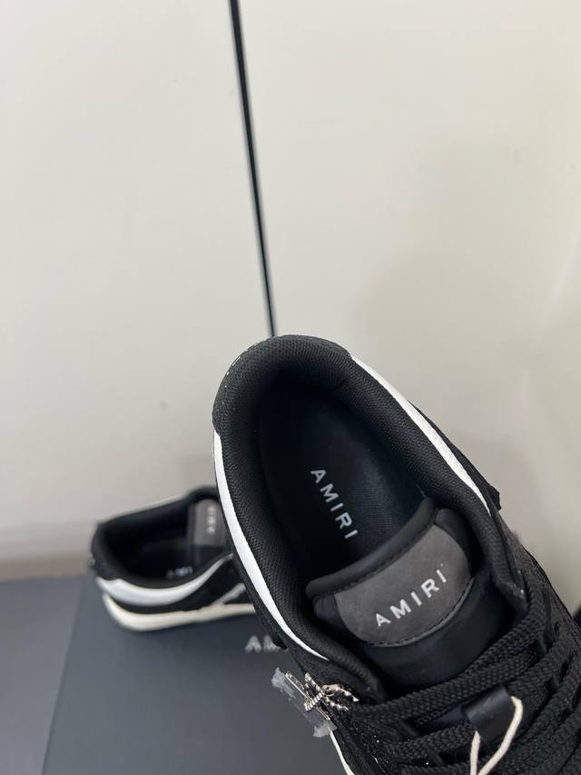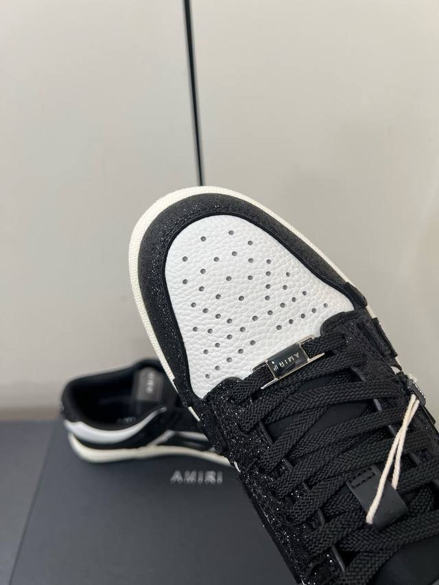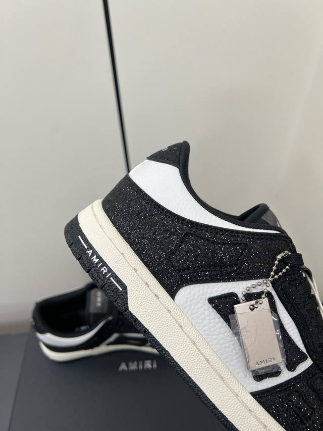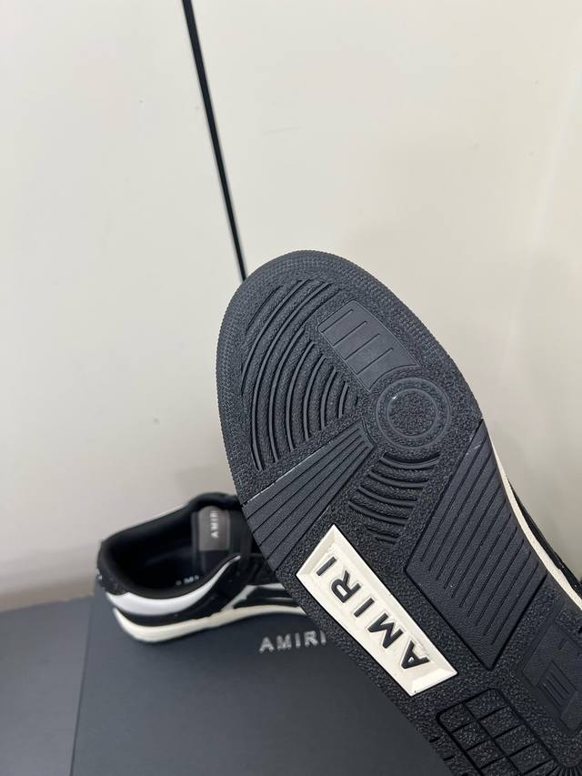 一款兼具奢华和街头风格的运动鞋,其设计和做工非常考究 采用高级皮革制成,触感柔软,耐用性强,呈现高端质感 鞋面装饰了 Amiri经典的骨头贴饰,边缘全油边工艺增添细节感 配备立体的ma四重字母组合外底,既有视觉冲击力,又增加品牌辦识度