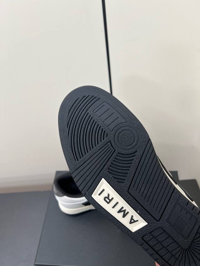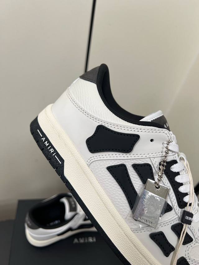 一款兼具奢华和街头风格的运动鞋,其设计和做工非常考究 采用高级皮革制成,触感柔软,耐用性强,呈现高端质感 鞋面装饰了 Amiri经典的骨头贴饰,边缘全油边工艺增添细节感 配备立体的ma四重字母组合外底,既有视觉冲击力,又增加品牌辦识度