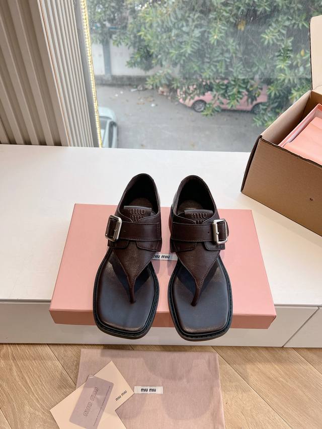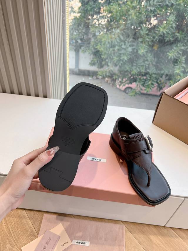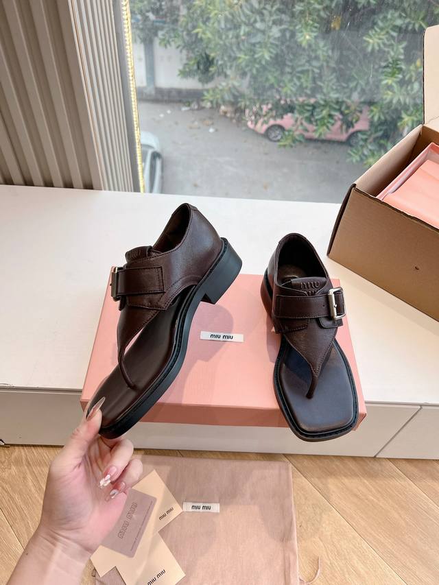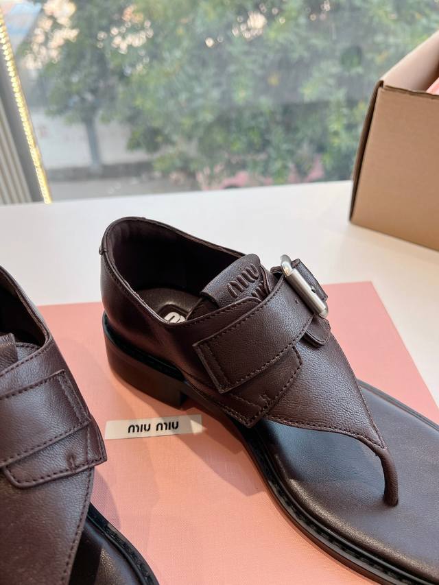 飞机盒带标g042顶级版本时装周凉鞋代购级别2025春夏时装周miu Miu钱币粗跟夹脚凉鞋谬谬新出的真的让人一整个心都融化除了中间夹着一颗钱币这种细节之外、方