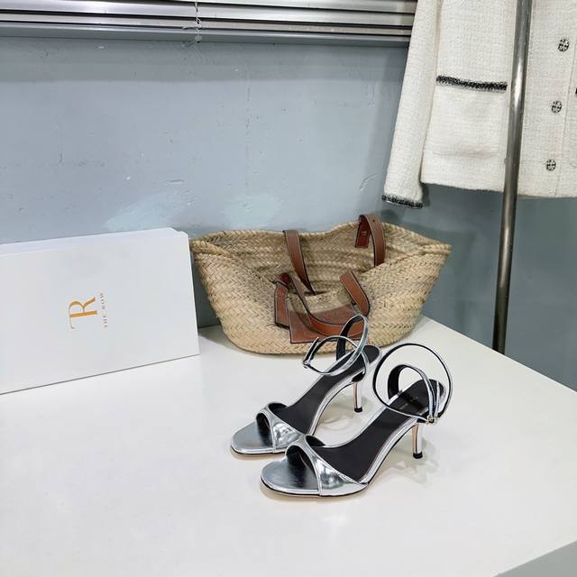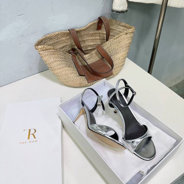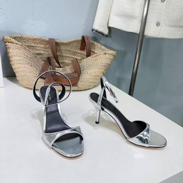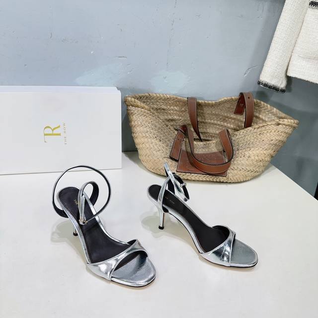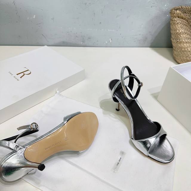 高品质出厂羊皮340!小众潮牌The Ro*25春夏新款简易金属皮面猫跟圆头凉鞋