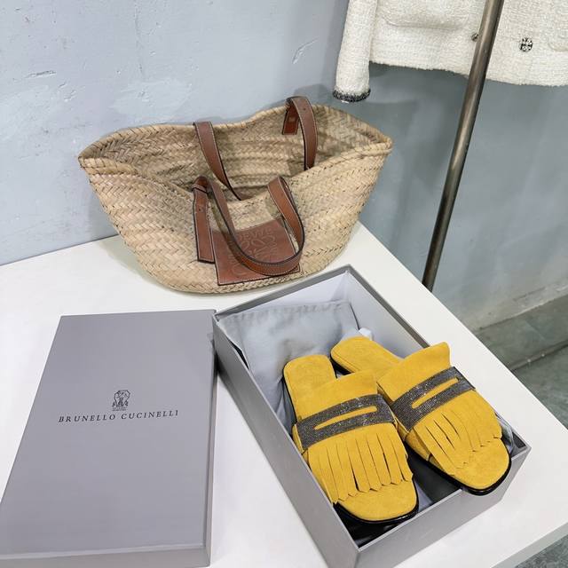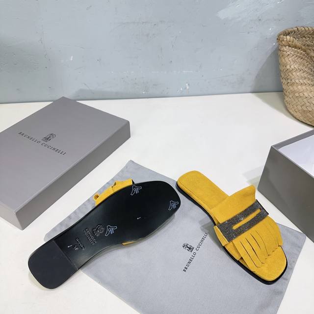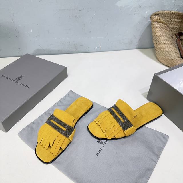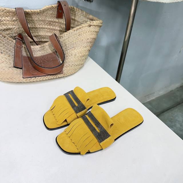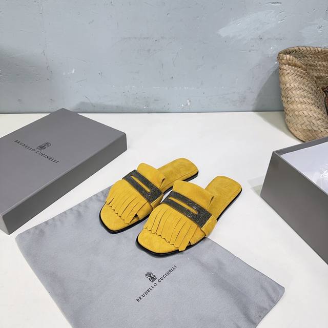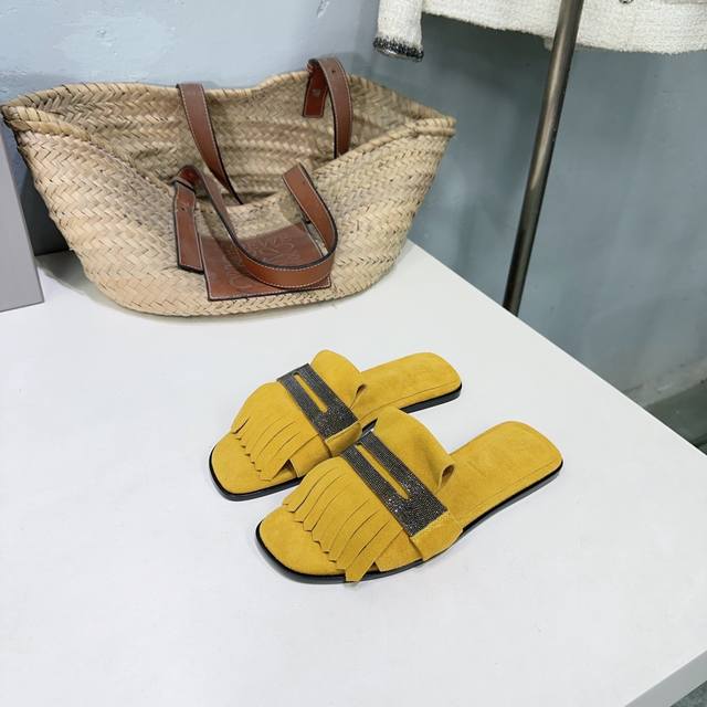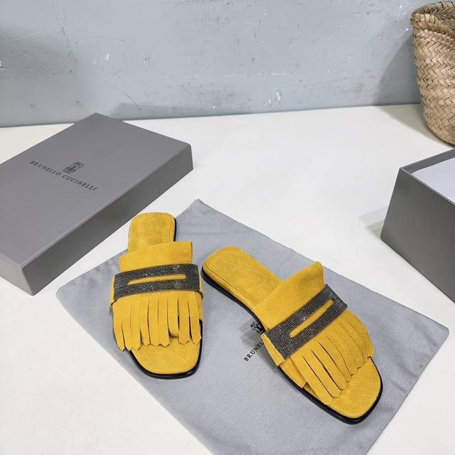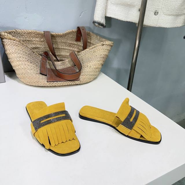 高品质出厂 !小众潮牌Brunellocucinelli 25春夏 Bc经典简易流苏钢钻平底拖鞋凉鞋!经典灵感定义了这款新高跟凉鞋的现代优雅风格。细腻的进口麂皮上展现着别致的斑驳,与超轻盈的真皮大底,让您在舒适中彰显时尚性格。给您带来更好的舒适度,又是款穿上就不愿脱下的一款经典鞋款,原版一比一复刻。