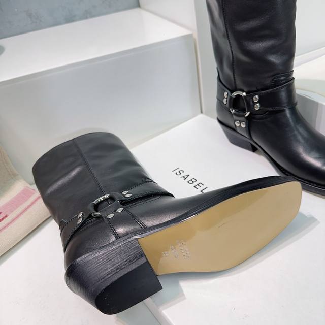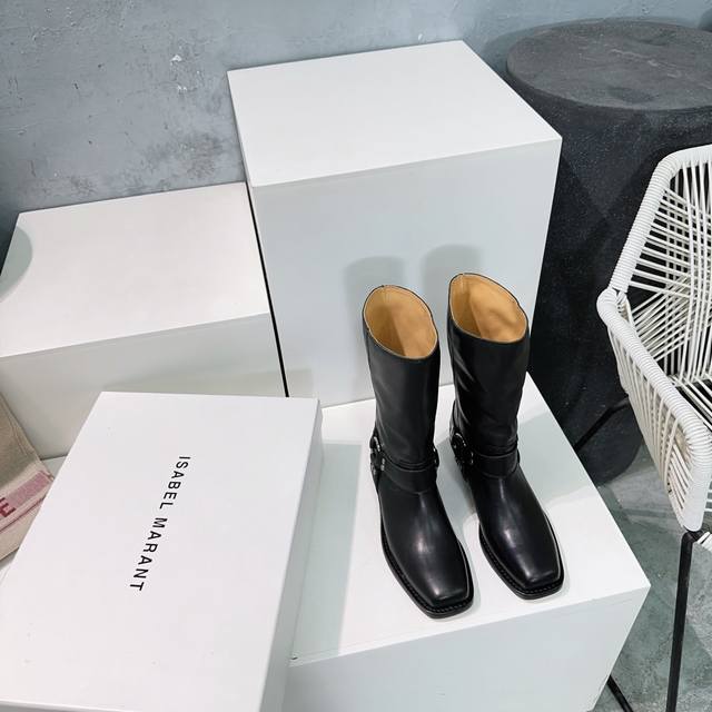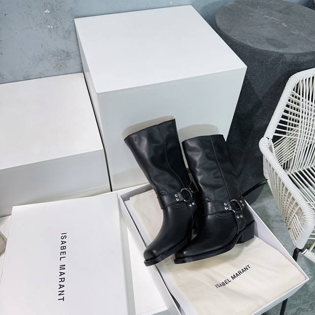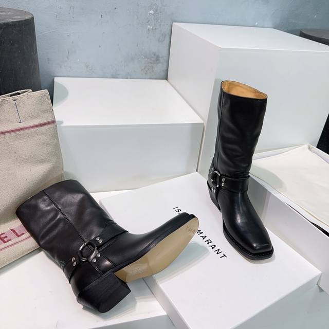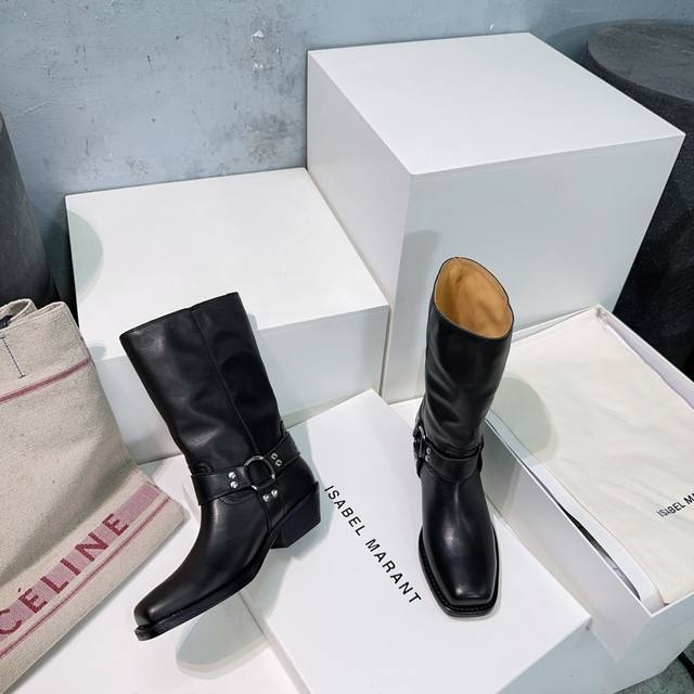 高品质出厂 !Isabel Marannt伊莎贝尔2025Ss秋冬复古五金圆扣带粗跟方头一脚蹬筒靴中靴!